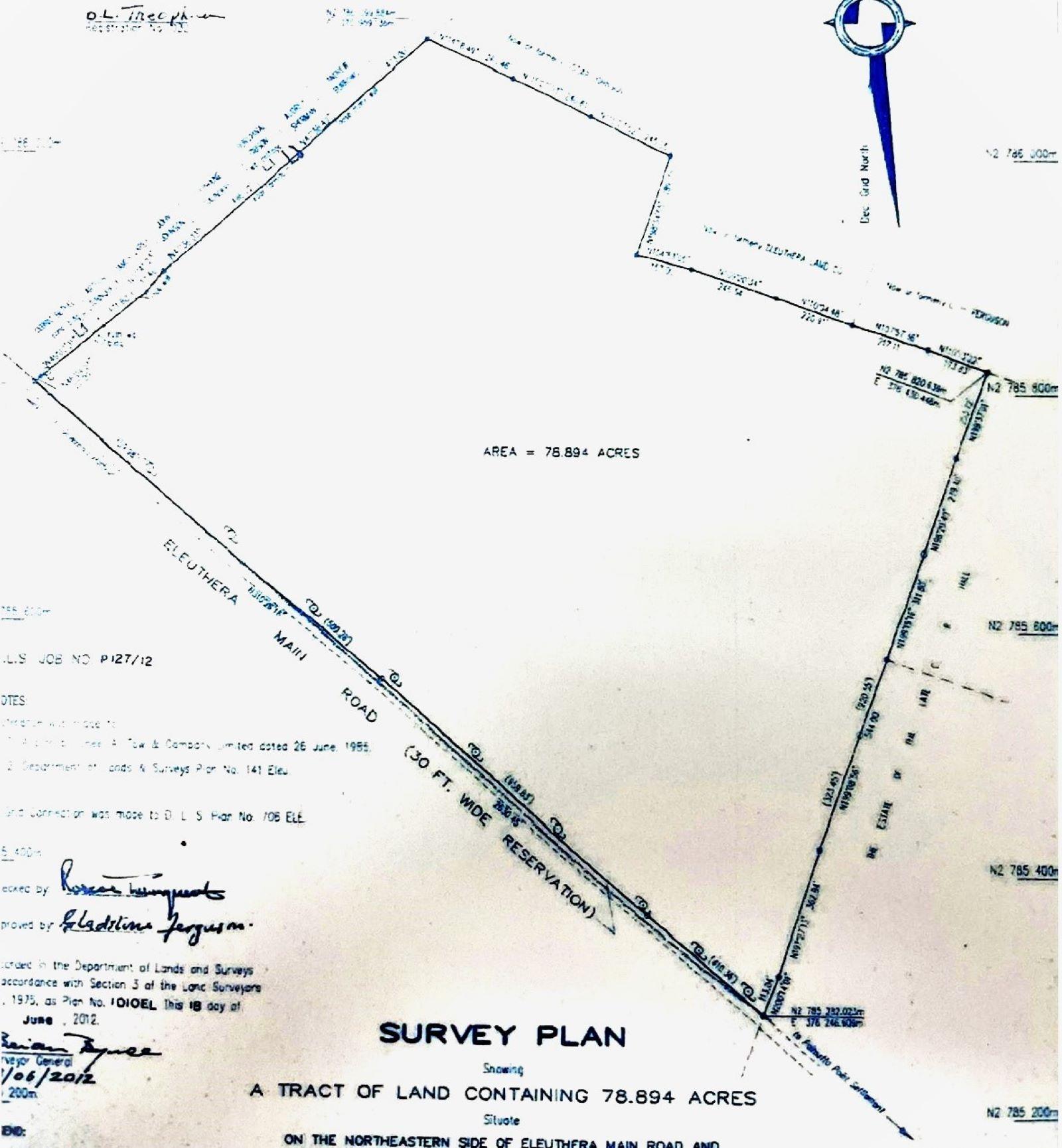 Situated one mile south of Governor’s Harbour on the east side of the King’s Highway this 78.89 acre tract has elevations up to 100 feet. Property is ideally situated for land development with spectacular sea views and elevations. All utilities are on the Highway. Eleuthera is situated approximately 50 miles east of Nassau at its nearest point. It was settled in 1648 by the Eleutheran Adventurers – a band of English Puritans who left Bermuda in search of religious freedom. They named the island Eleuthera, which means Freedom (Eleftheria in Greek). The Adventurers founded what was probably the first democracy in the western world. Eleuthera is over 100 miles long and has lots of gorgeous pink and white sandy beaches, mainly on the ocean (east) side of the island. Numerous settlements dot the island and two offshore islands – Spanish Wells and Harbour Island - lie off the northern end. Governor’s Harbour is considered the middle of the island and has the largest population. It houses the government administrative centre.