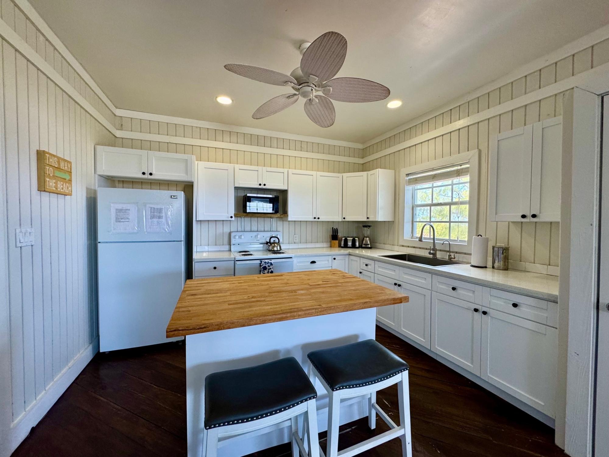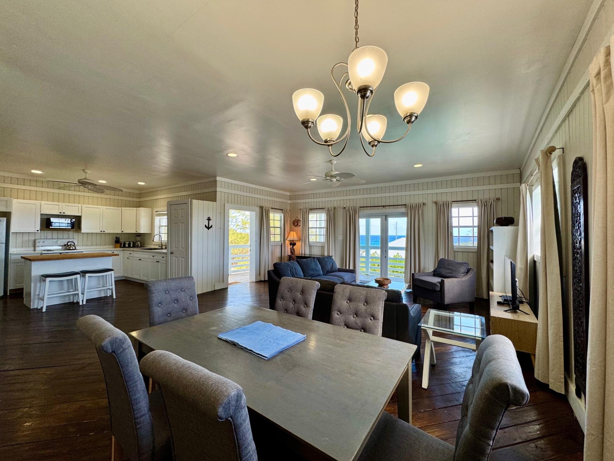 Welcome to Sugar Apple, a charming tropical escape nestled in the heart of Rainbow Bay, one of Eleuthera's most beloved communities. Perched above the Atlantic Ocean, this delightful 3-bedroom, 2-bathroom home offers breathtaking views and an effortless blend of comfort, style, and island living. From the moment you enter the open-concept great room, you're greeted by warm wood floors, a spacious kitchen with a butcher block island, and a seamless flow between indoor and outdoor spaces. Whether you're sipping your morning coffee with panoramic ocean views or hosting friends and family, Sugar Apple is made for relaxed, easy living. Step through the sliding doors onto the wrap-around wooden deck, where a sparkling private pool awaits. The master suite and great room both open to the outdoors, creating a natural extension of the living space and making the most of the stunning views and island breeze. This well-built concrete structure is fully equipped with all utilities and high-speed internet and has a proven track record as a successful vacation rental, making it an ideal investment