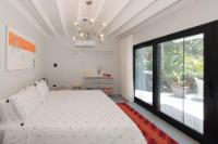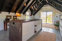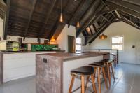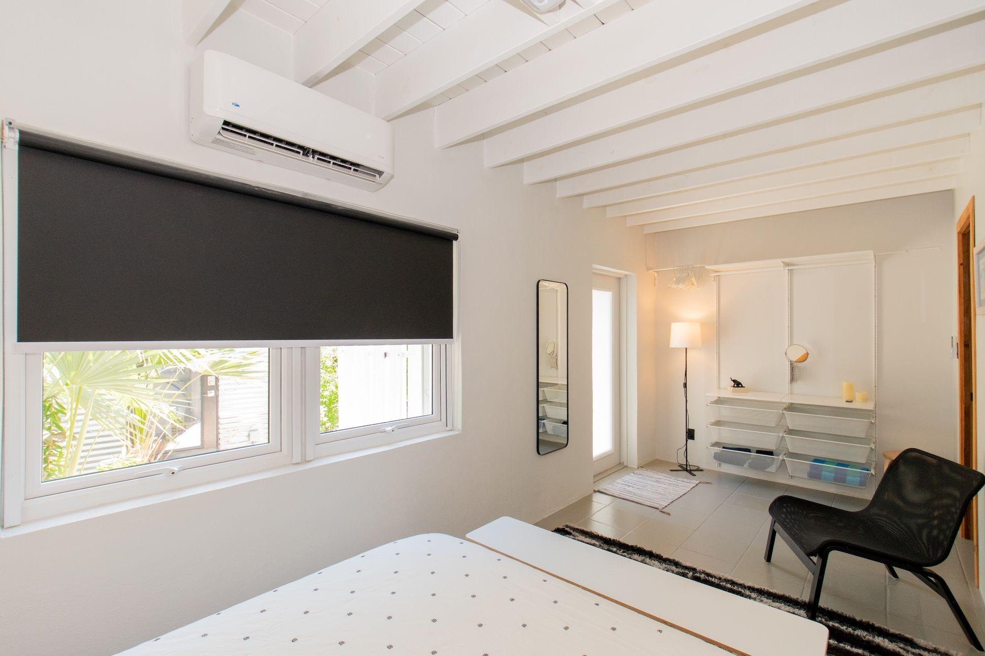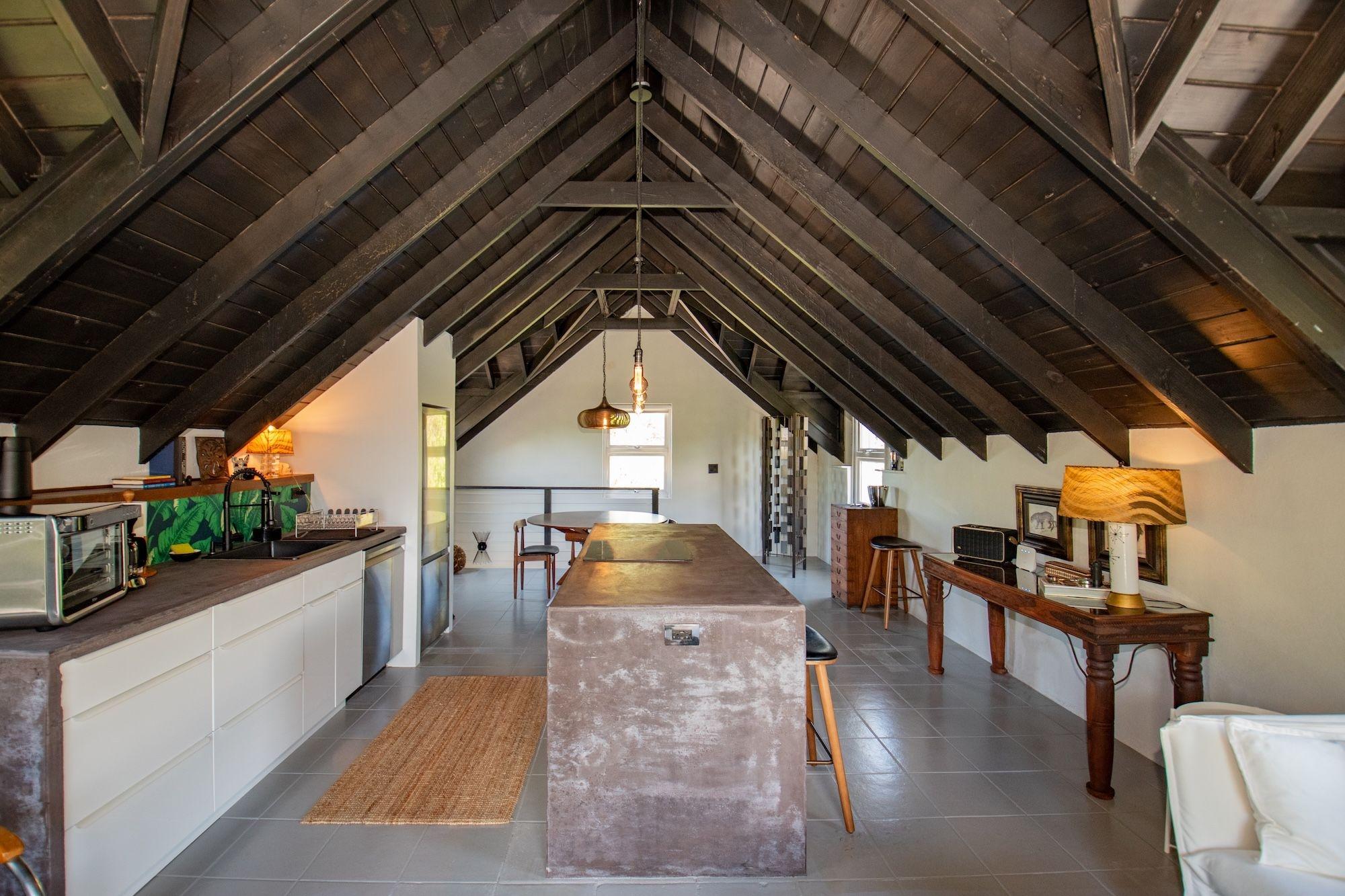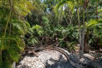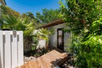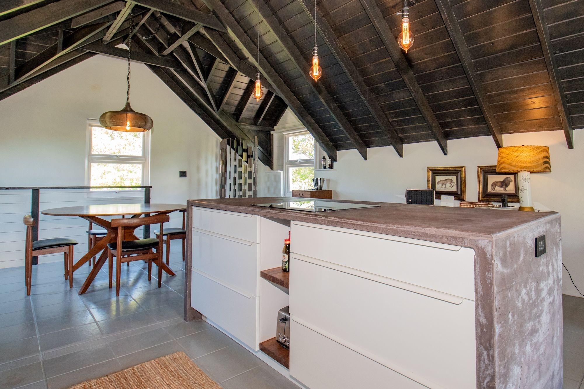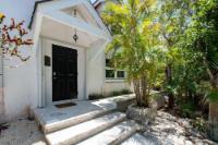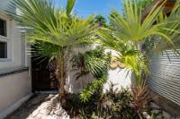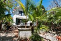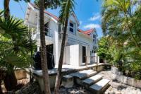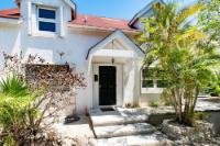 Tattoo’s Garden Casita is a newly remodeled 2-bedroom home located just minutes from Surfer’s Beach and Gregory Town. Surrounded by lush, mature landscaping, it feels like a private garden retreat. Both bedrooms open to a wrap-around patio with an enclosed outdoor shower, BBQ grill, and outdoor dining area. The home’s unique layout places the bedrooms on the ground floor and an open-concept kitchen, living, and dining space above, featuring vaulted black-stained ceilings, black concrete countertops, and a large kitchen island with bar seating. A balcony with hammock swings overlooks the garden and offers ocean glimpses. Downstairs, a bar nook with Nespresso machine, mini-fridge, and sink provides added convenience. Stone walkways wind through tropical foliage and a serene Buddha statue.