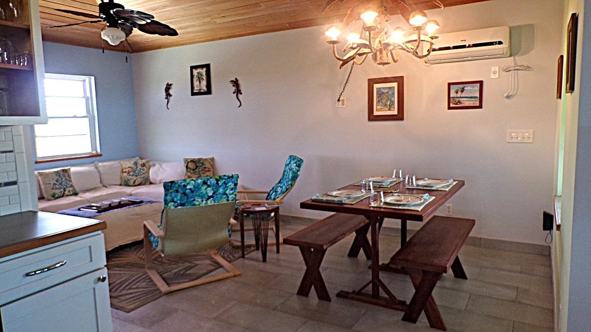 The Boat House offers two bedrooms and one bathroom, elevated 14 feet above ground for enhanced views and breezes. Below, a spacious garage provides ample room for up to four vehicles or a combination of a boat and car. Relax on the covered porch, where you can enjoy gentle island breezes and scenic vistas, perfect for quiet mornings or serene evenings. Just a short stroll away lies the beach—ideal for sunbathing, leisurely walks, and watching breathtaking tropical sunsets.