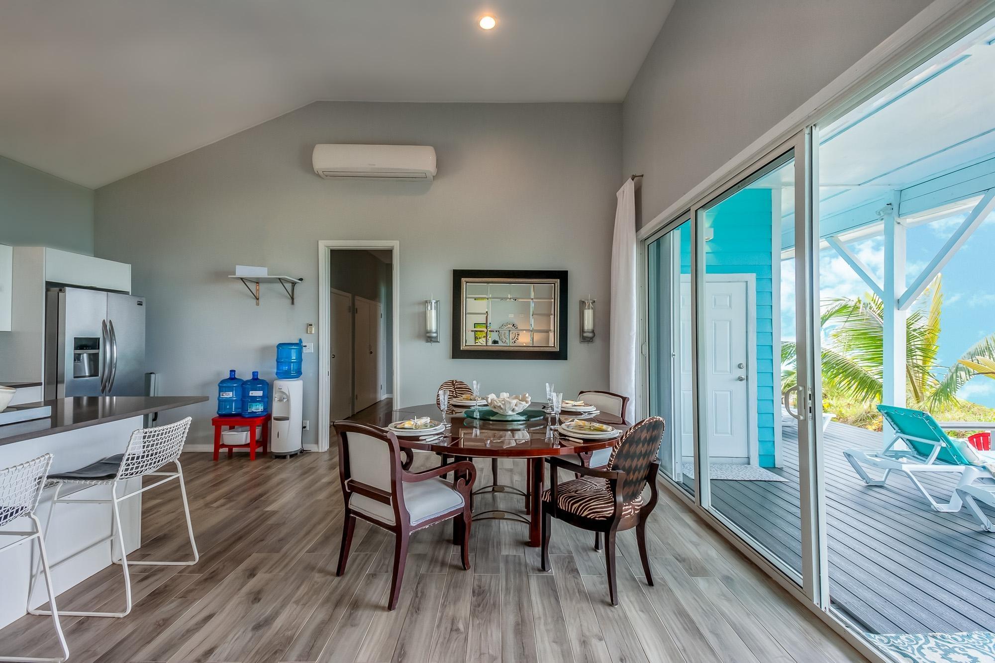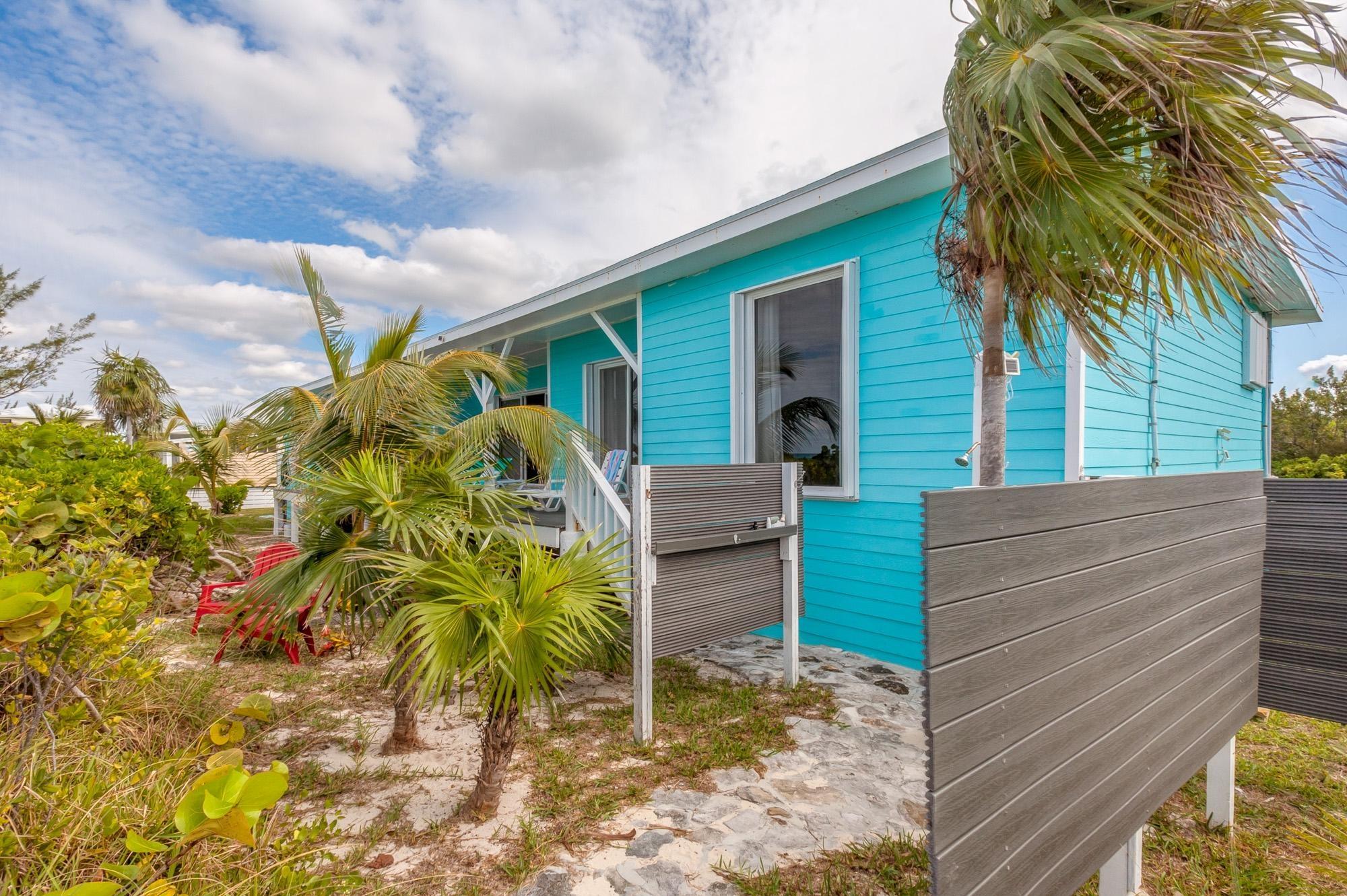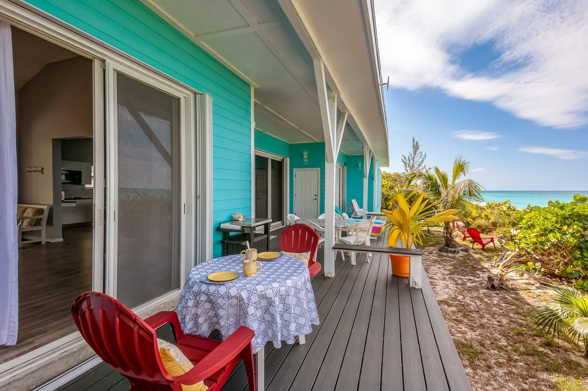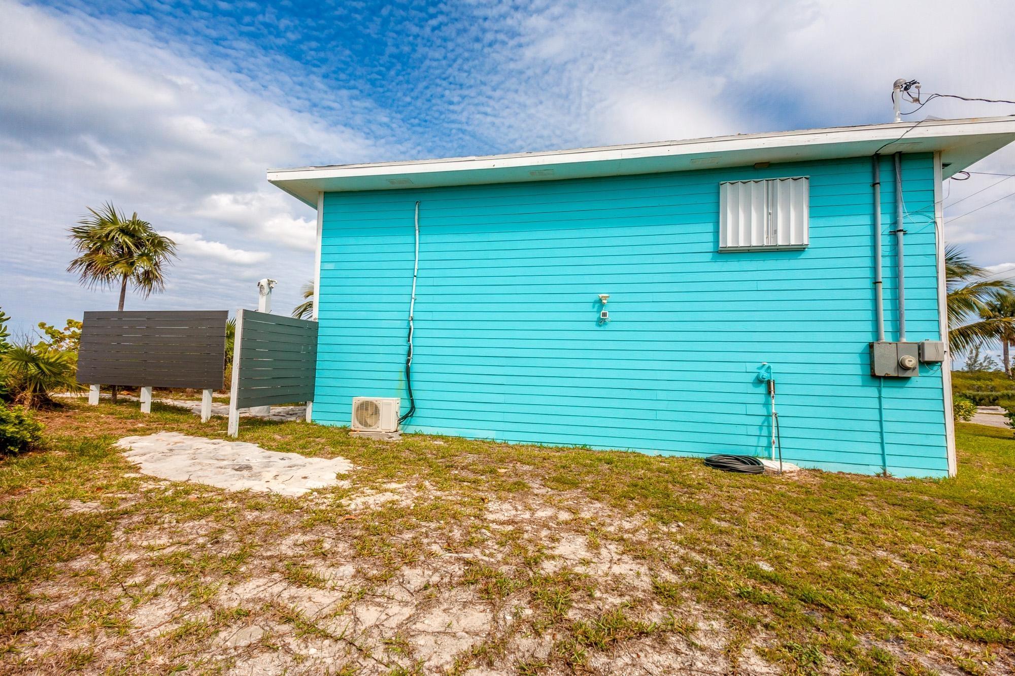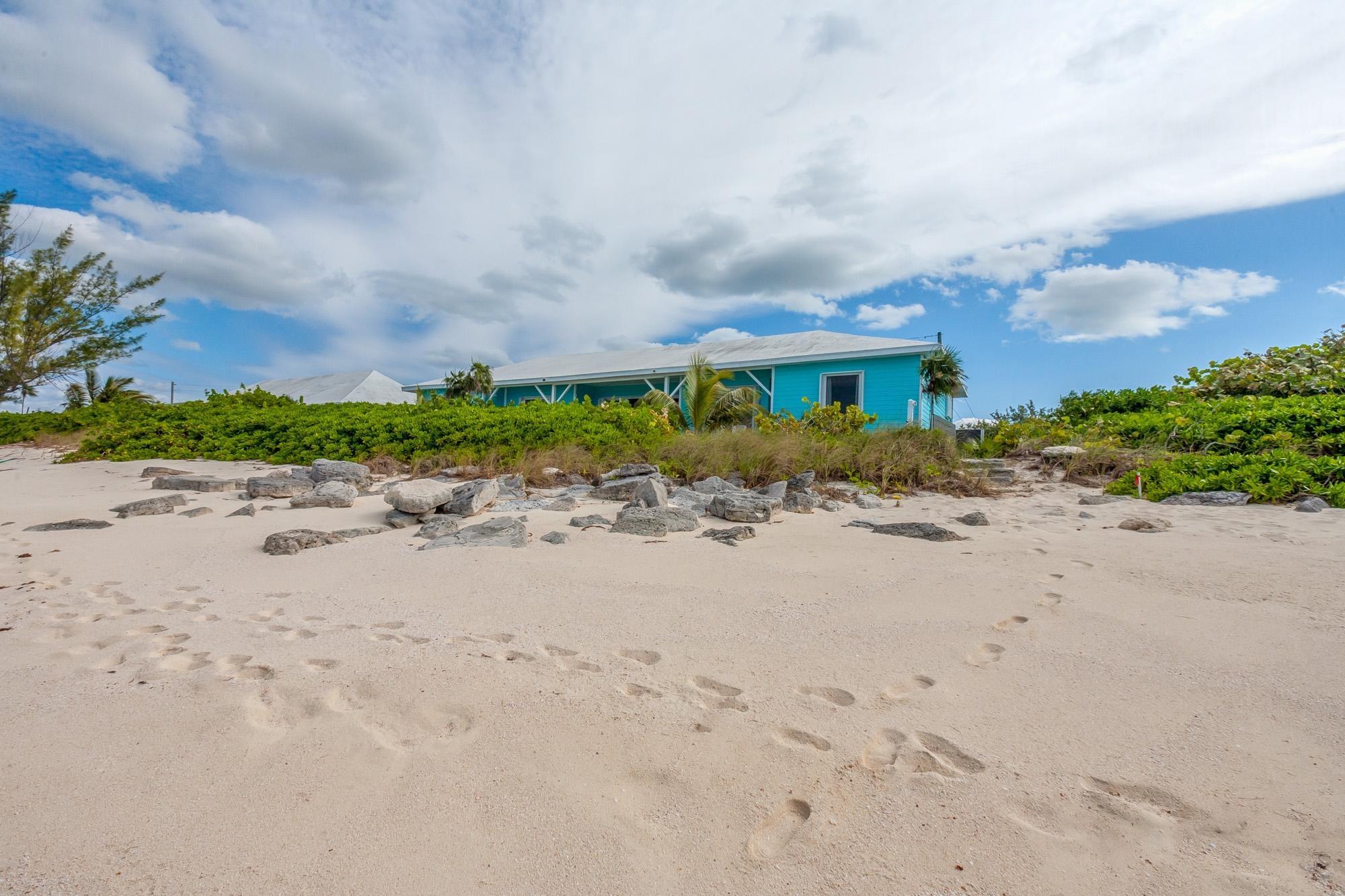 PARTIAL OWNER FINANCING -Meticulously maintained, thoughtfully crafted single-family residence with 100 ft of beachfront on San Salvador. Built in 2022, the home includes three bedrooms and two bathrooms in an open layout designed to make the most of ocean views and cooling breezes. The floorplan allows for separation into a 1 bedroom (king), 1 bathroom unit and a 2 bedroom (king and queen) 1 bathroom living space, both with independent entries, kitchens and decks. Practical tile flooring, split AC units, vaulted ceilings, impact windows and hurricane shutters create a comfortable and secure beachfront property. The main kitchen features quartz countertops, smudge-resistant stainless steel appliances, and direct access to an outdoor deck—ideal for al fresco meals. Mature coconut palms, marine-grade exterior lighting, outdoor shower, BBQ pit, and an all-weather deck maximize outdoor living. A stone path leads directly to the sandy beach. The entire home or either side can be used as a rental. Located a few minutes from town and accessed by paved roads. Offered partially furnished.
