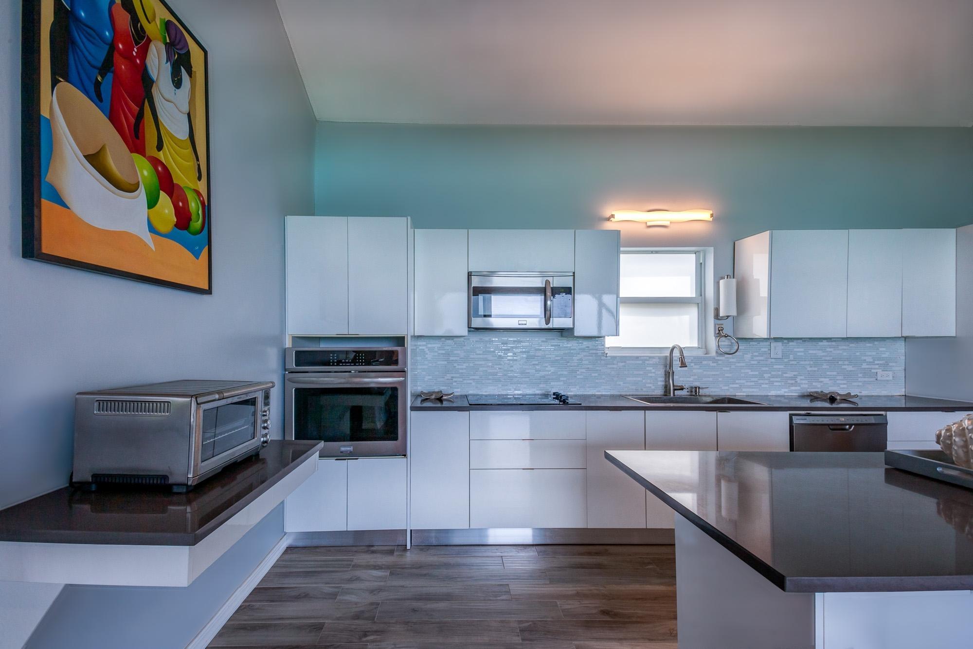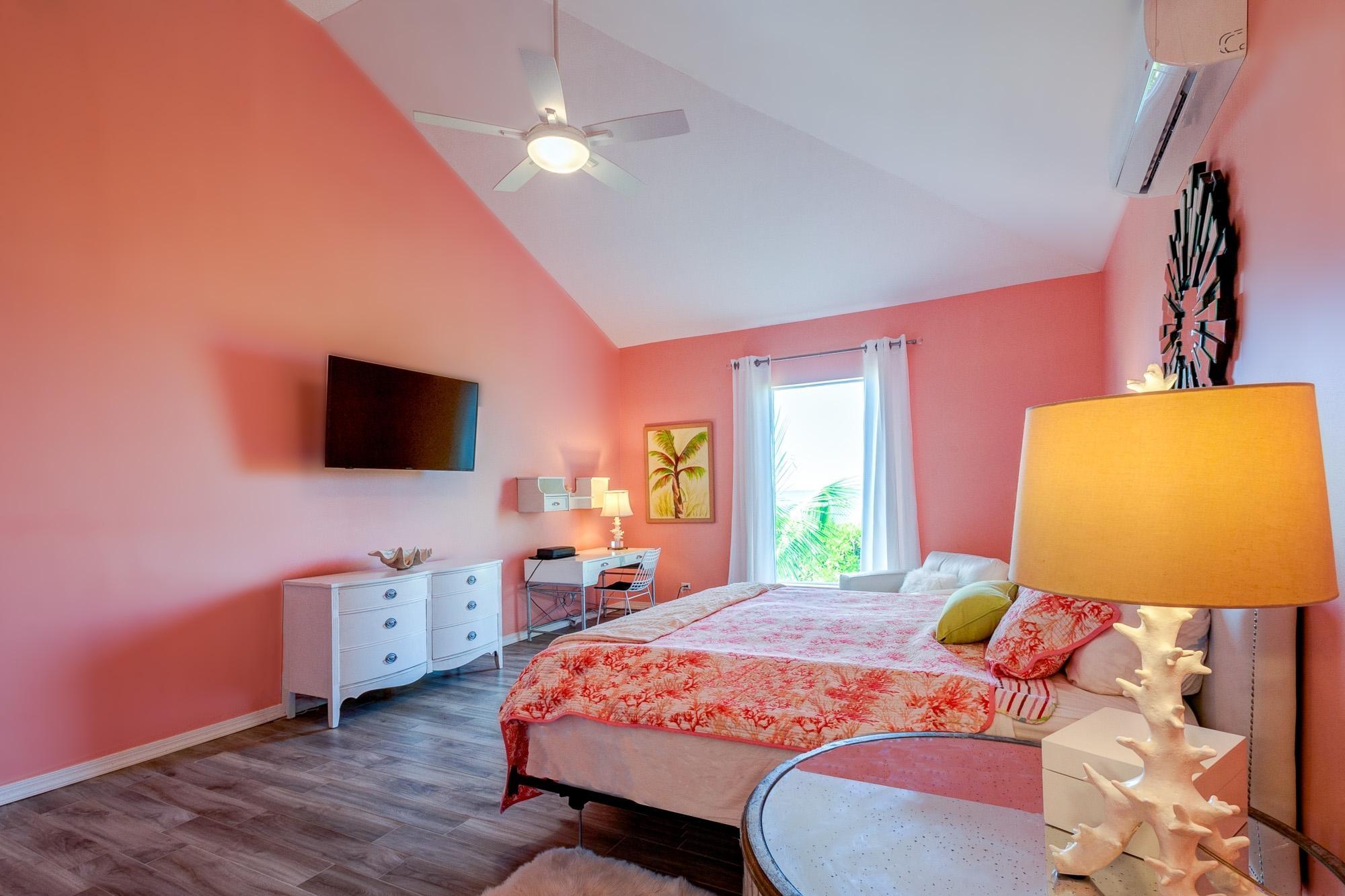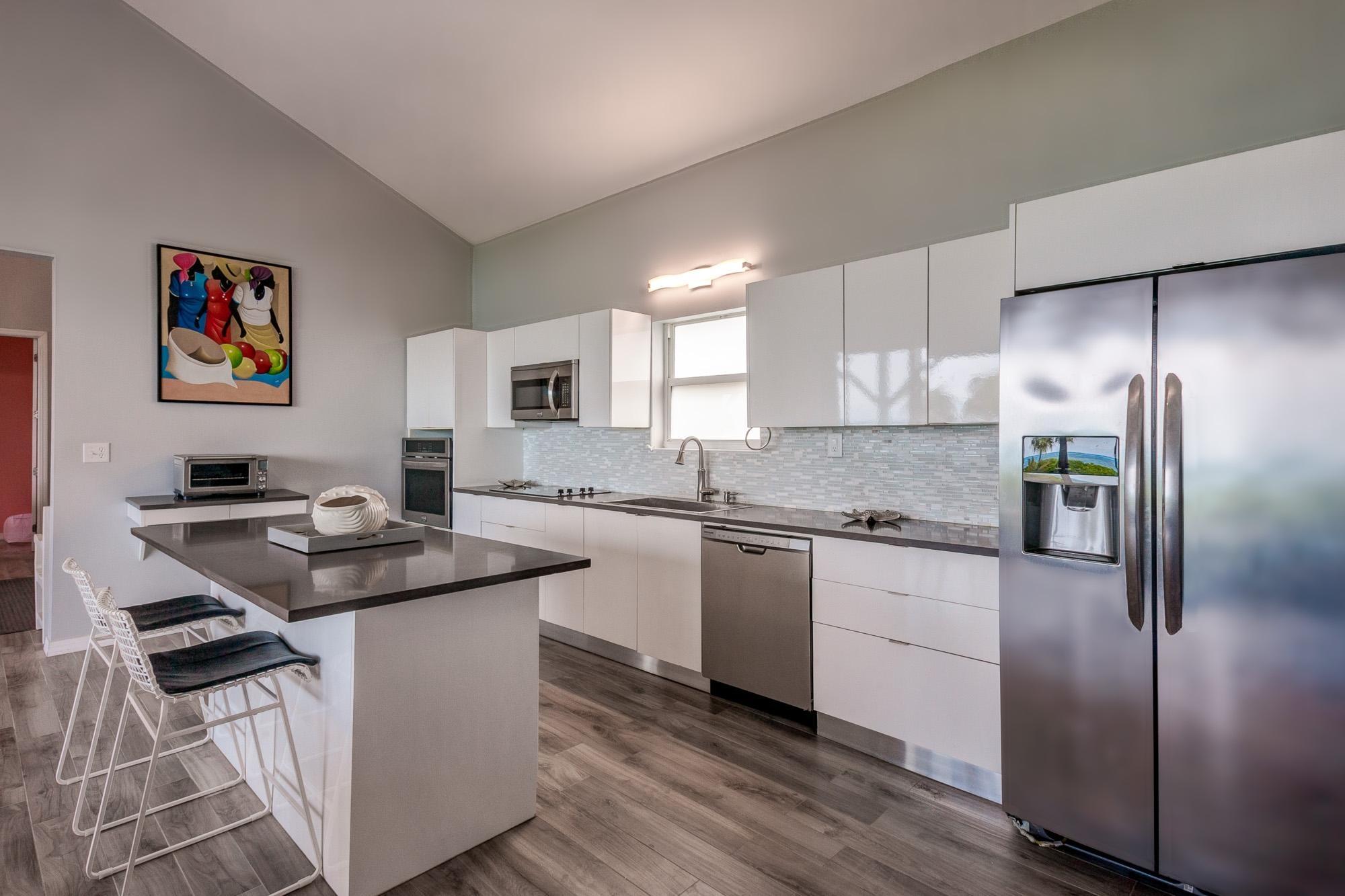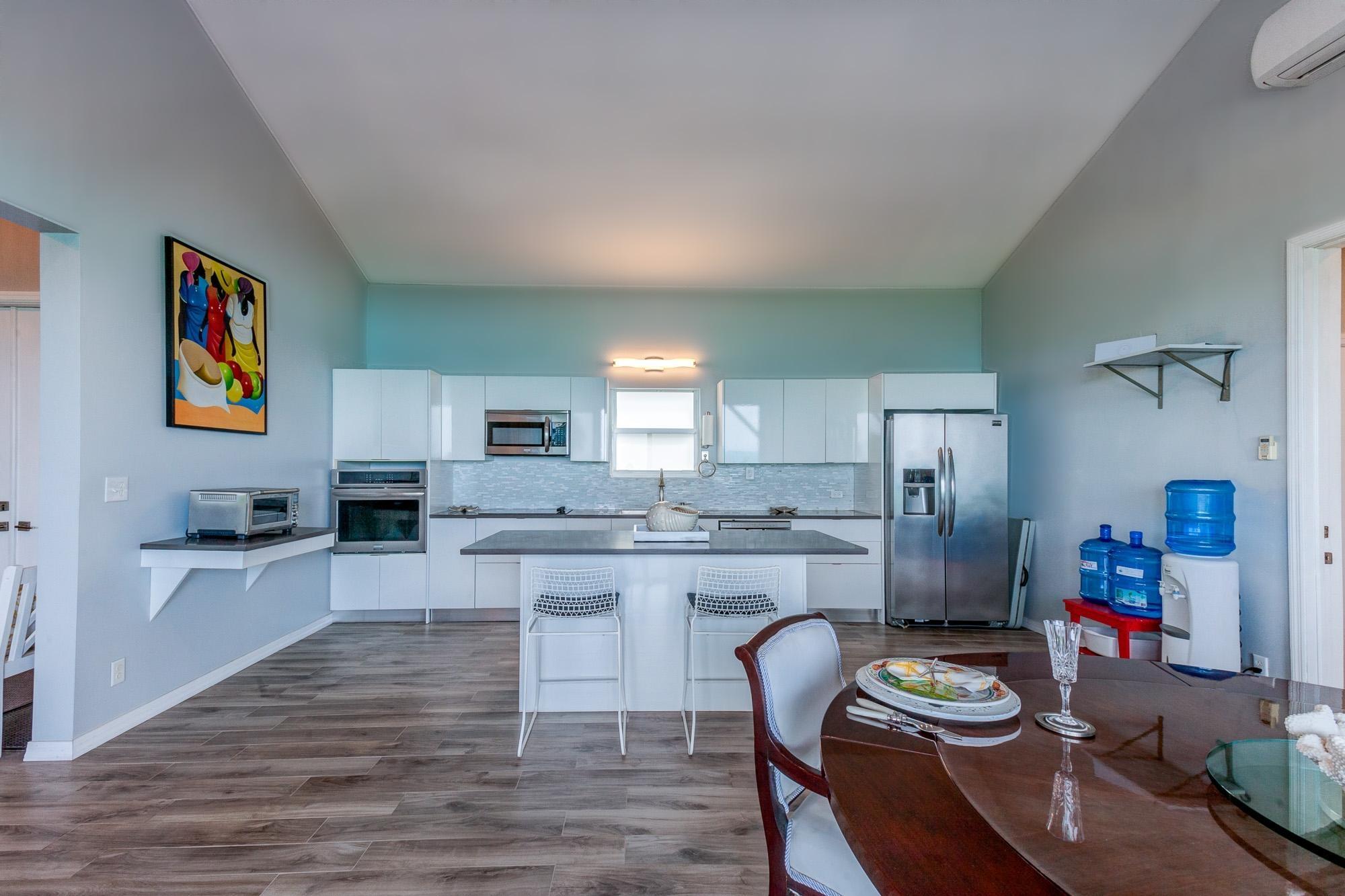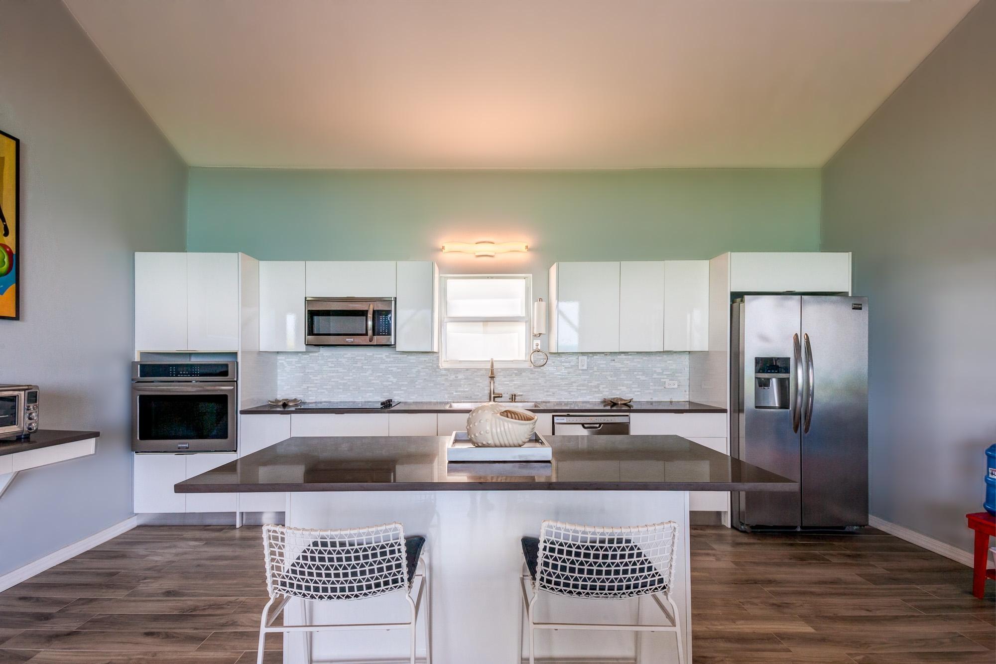 PARTIAL OWNER FINANCING -Meticulously maintained, thoughtfully crafted single-family residence with 100 ft of beachfront on San Salvador. Built in 2022, the home includes three bedrooms and two bathrooms in an open layout designed to make the most of ocean views and cooling breezes. The floorplan allows for separation into a 1 bedroom (king), 1 bathroom unit and a 2 bedroom (king and queen) 1 bathroom living space, both with independent entries, kitchens and decks. Practical tile flooring, split AC units, vaulted ceilings, impact windows and hurricane shutters create a comfortable and secure beachfront property. The main kitchen features quartz countertops, smudge-resistant stainless steel appliances, and direct access to an outdoor deck—ideal for al fresco meals. Mature coconut palms, marine-grade exterior lighting, outdoor shower, BBQ pit, and an all-weather deck maximize outdoor living. A stone path leads directly to the sandy beach. The entire home or either side can be used as a rental. Located a few minutes from town and accessed by paved roads. Offered partially furnished.