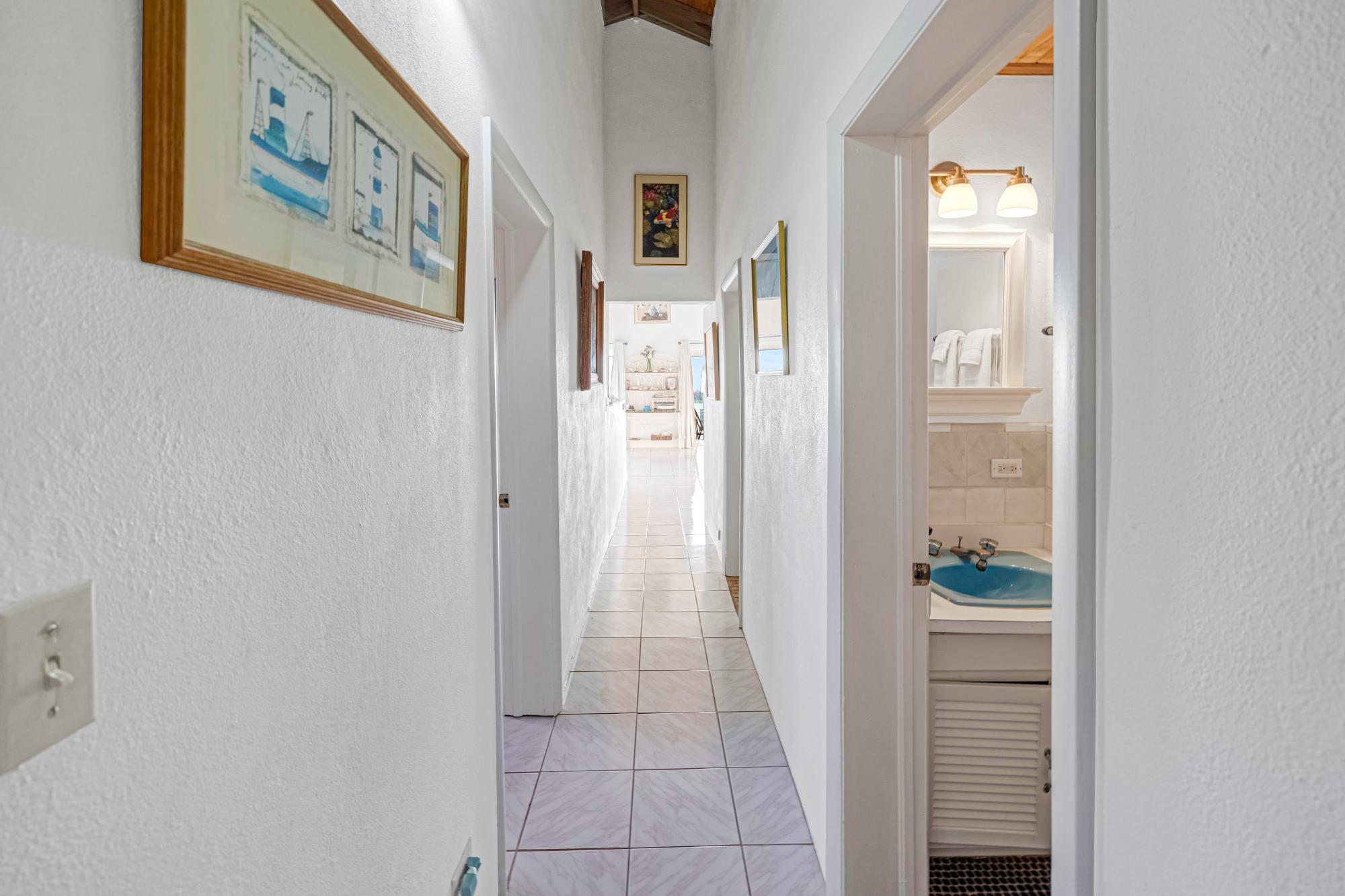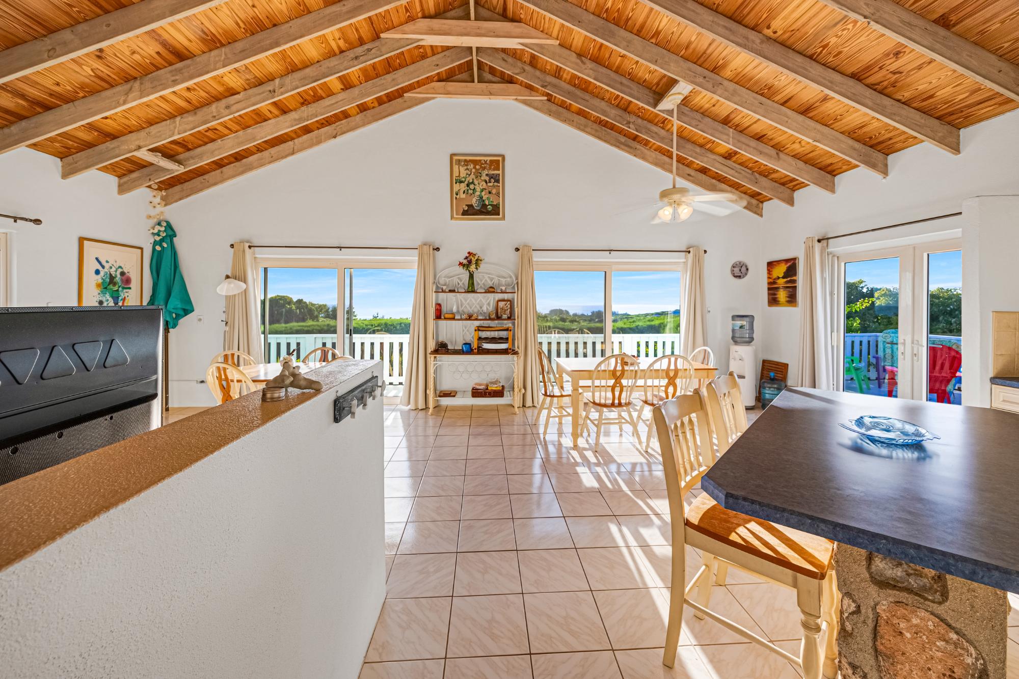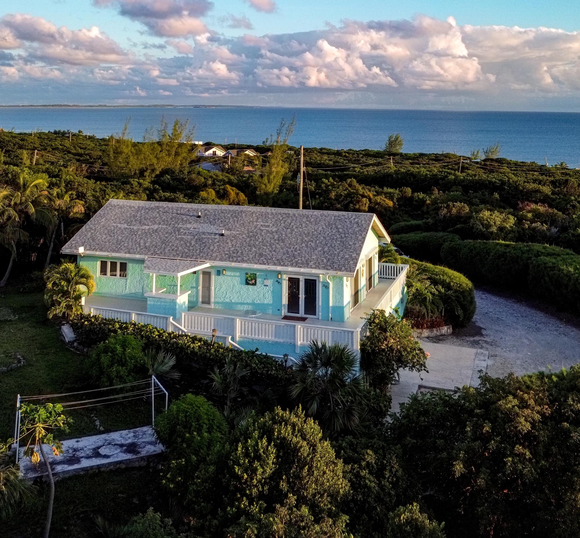 Perched on an elevated hilltop in Rainbow Bay, Eleuthera, “Due North” offers breathtaking 180° views of both the Caribbean and Atlantic Oceans. Enjoy stunning sunrises and sunsets from this meticulously maintained, turnkey concrete home — sold with three additional lots totaling 1.25 acres for added space and privacy. This 1,400 sq. ft. energy-efficient home features an open-concept design with a bright white kitchen, native stone accents, and hurricane-rated glass doors that flood the space with natural light. It offers three bedrooms, two full baths, ample storage, and a spacious 790 sq. ft. patio — perfect for outdoor entertaining. Additional highlights include a 22kw backup generator, 17,000-gallon rainwater cistern, two-car garage, covered outdoor shower, and beautifully landscaped tropical gardens. The main beach is just a 2-minute walk away, with grocery stores, restaurants, and other conveniences nearby. Rainbow Bay amenities include five beaches, a boat ramp, tennis court, and well-kept parks — all for a low annual HOA fee of $280.