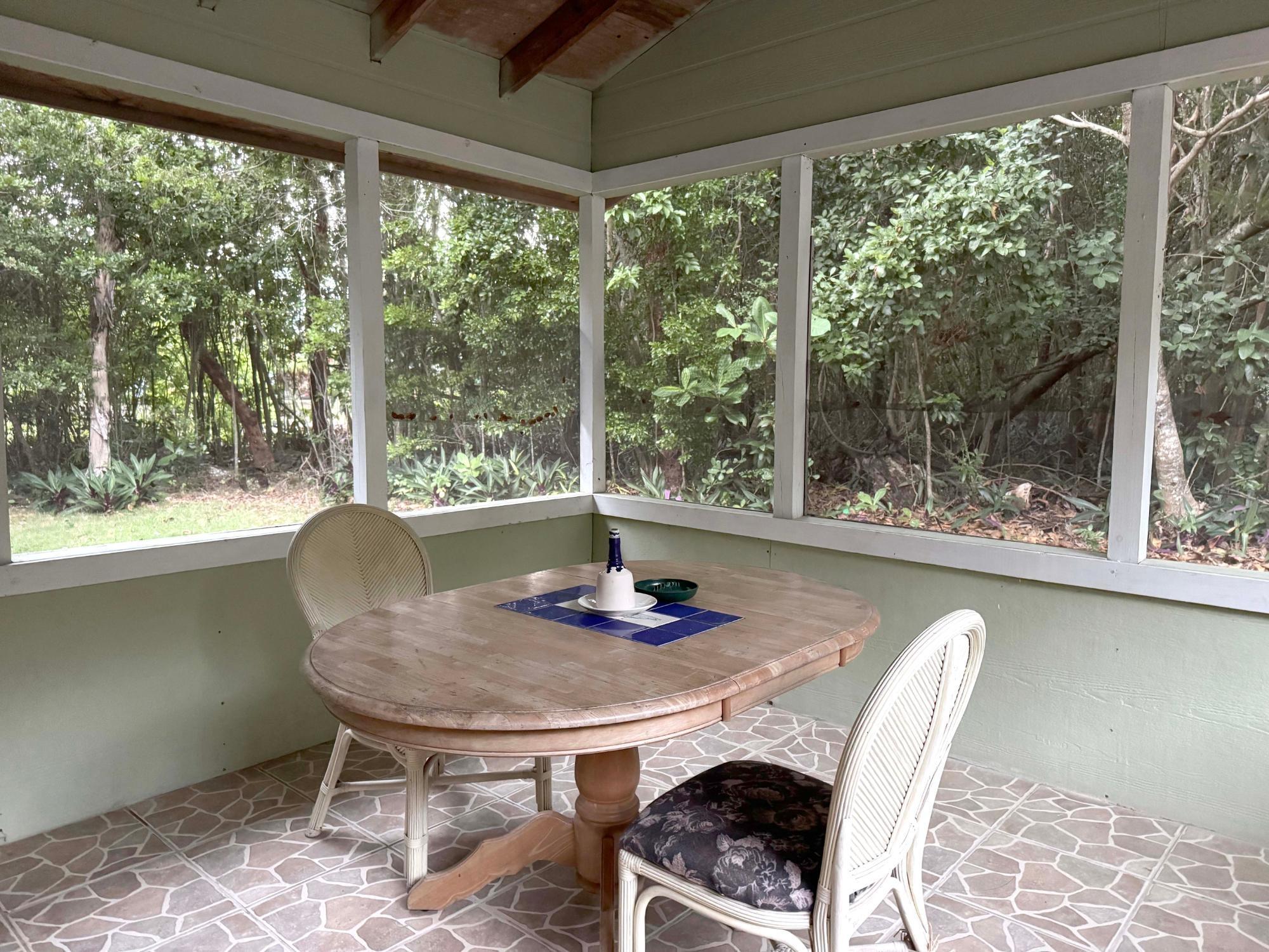 Fully furnished 2-bedroom, 1-bath villa with a warm, inviting island feel just a short walk from the beach. This Andros cottage features wood-paneled accents, tile flooring throughout, split A/C units, and an open living and dining layout designed for comfort and ease. The screened-in patio expands the usable living space and is perfect for outdoor dining or relaxing in the natural surroundings. Positioned on a private, tree-lined lot, the home offers excellent short-term rental potential and is fully move-in or rental-ready. A charming island retreat with consistent appeal for vacationers and long-term guests alike.