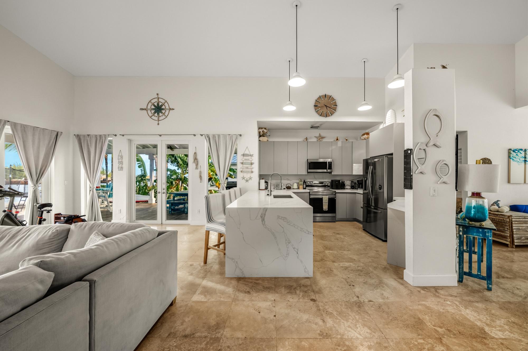 Welcome to Bliss on the Bay, a beautifully maintained Harbor Island model home ideally positioned directly on the bayfront within the prestigious, private gated community of Bimini Bay Resort & Marina. This exceptional residence offers stunning panoramic views of crystal-clear turquoise waters just steps behind the home, paired with breathtaking sunsets that provide the perfect close to each island day. This spacious four-bedroom, three-bathroom villa offers approximately 2,580 sq. ft. of air-conditioned living space, thoughtfully designed on one single level to maximize comfort, flow, and unobstructed water views. Ideal for families, entertaining, or larger groups; the home’s open-concept layout seamlessly blends indoor and outdoor living.Step through the doors onto an impressive 1,200 sq. ft. wraparound open-air and covered terrace, perfectly positioned to capture the cooling tropical breeze and uninterrupted bay views. This expansive outdoor space is ideal for morning coffee, sunset cocktails, alfresco dining, or simply relaxing while overlooking the tranquil waters.