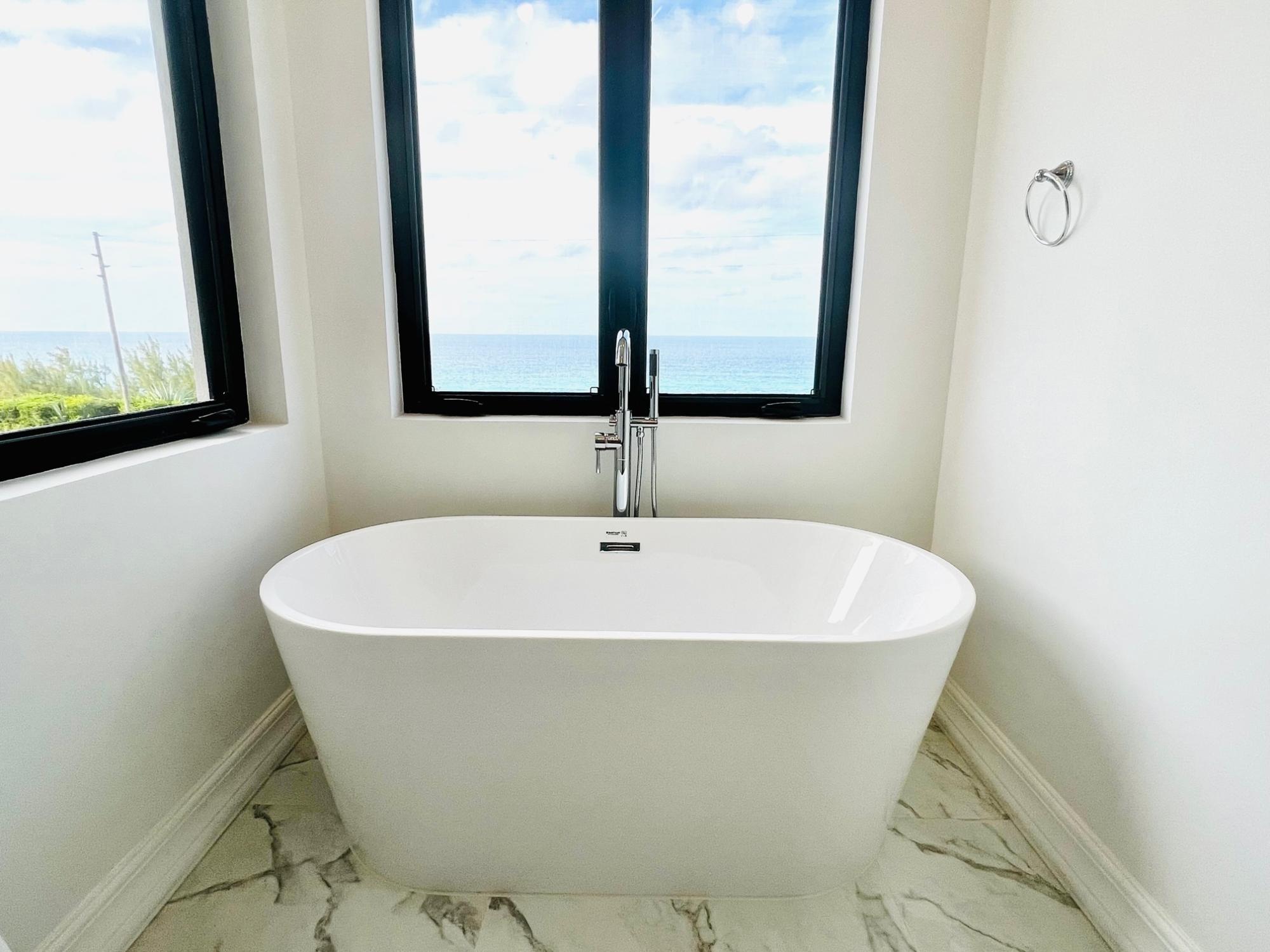 This immaculate, high-end modern home features three bedrooms and two-and-a-half baths and is perfectly situated in the sought-after Rainbow Bay community. Set on elevated ground, it offers dramatic, unobstructed views of the Atlantic Ocean. From this privileged vantage point, spectacular sunrises unfold daily. Conveniently located near airports, ferry terminals, shops, restaurants, bakeries, and everyday amenities — and just moments from a remarkable collection of secluded beaches — this property offers the perfect balance of privacy and accessibility. Solidly constructed on a rocky ridge by an experienced contractor in 2023, this attractive home is bright, breezy, and beautifully appointed, with stunning ocean views from every room. The thoughtfully designed interior showcases a clean, contemporary aesthetic with careful attention to detail throughout, including an open-plan kitchen, dining, and living area enhanced by an impressive tray ceiling, soaring 11.5-foot ceilings, granite countertops, stainless steel Samsung appliances, modern cabinetry, LED lighting