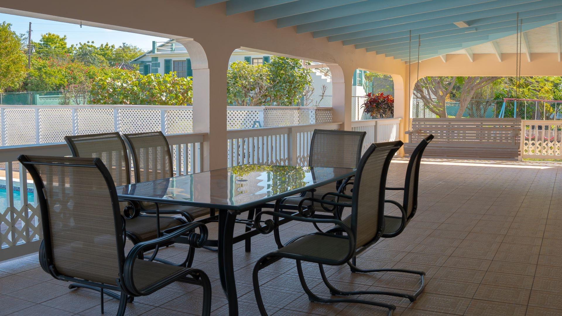 Spacious family home with swimming pool located on Russell Island, Spanish Wells, Bahamas. This well-appointed residence offers three bedrooms, three bathrooms, a home office, and a large kitchen and living area—perfect for family living or hosting guests. The living room and primary bedroom open directly onto a refreshing swimming pool and expansive patio, ideal for outdoor dining and entertaining. The generous grounds are a gardener’s delight, featuring mature fruit trees and ample space for a vegetable garden. Additional features include a formal dining room, laundry room, two-car garage, hurricane shutters, generator, and a large rainwater cistern. Conveniently located near the bridge to Spanish Wells, parks, and marinas, this beautiful home offers comfort, space, and an excellent island location.