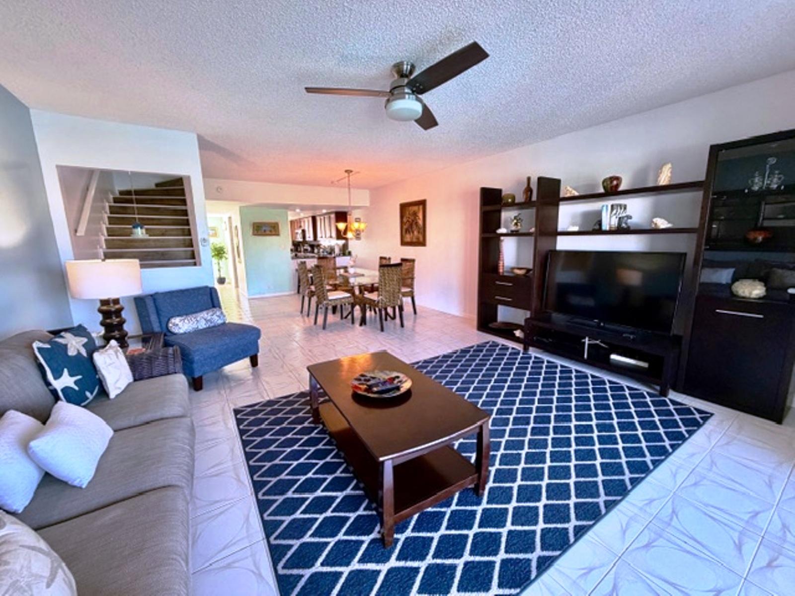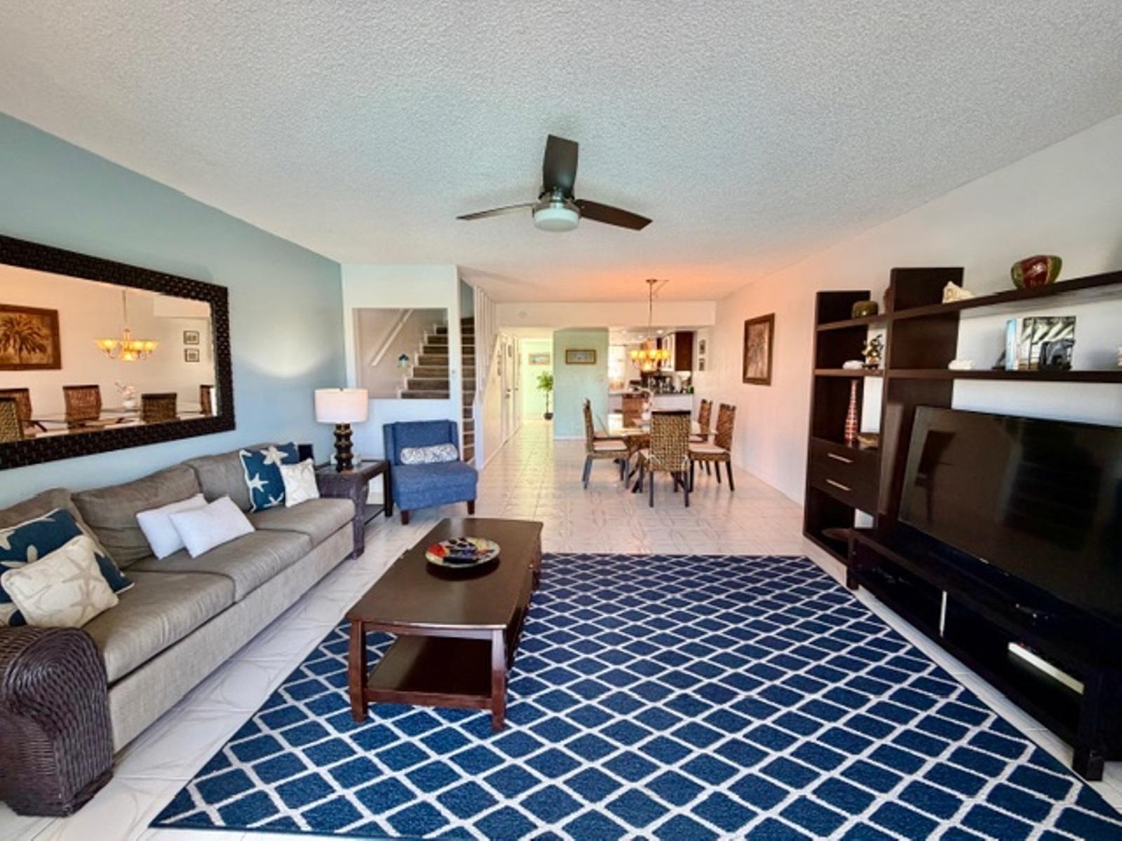Enjoy the comfort of this newly renovated condo with great potential for short-term rental income! This condo is extremely spacious and bright. It consists of 2 bedrooms, 2.5 bathrooms, a kitchen, a living room, and a dining room. The condo offers amazing views from 2 large balconies, one from the main living area and one from the master bedroom, looking out onto the beautiful blue waters of the Xanadu beach channel. This condominium complex of just 12 units within a larger, gated community located on the sea channel in walking distance of Xanadu beach. The complex has a pool surrounded by palm trees overlooking the channel. The condo has 2 bathrooms and a powder room on the main floor. There's a laundry room tucked under the stairs with a front-load Bosch washer and dryer for added convenience. The kitchen is very large and custom-designed, featuring pot drawers, a built-in dishwasher cabinet, a slide-out garbage compartment for a seamless look, and granite countertops and backsplash. There is ample cupboard space and a large pantry as well for all your small kitchen appliances.