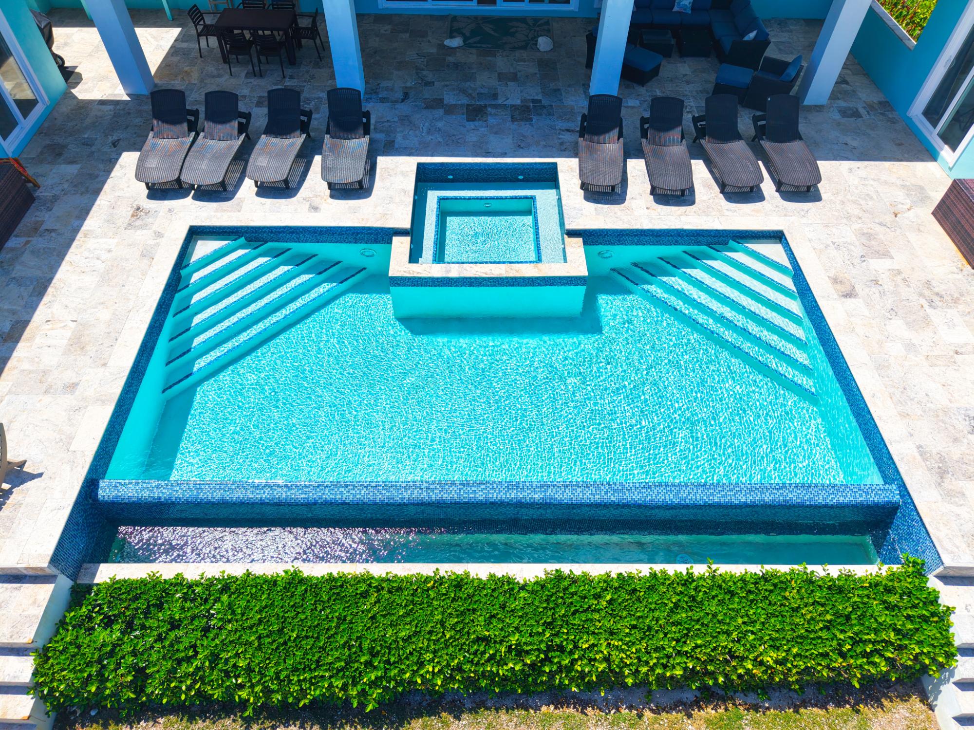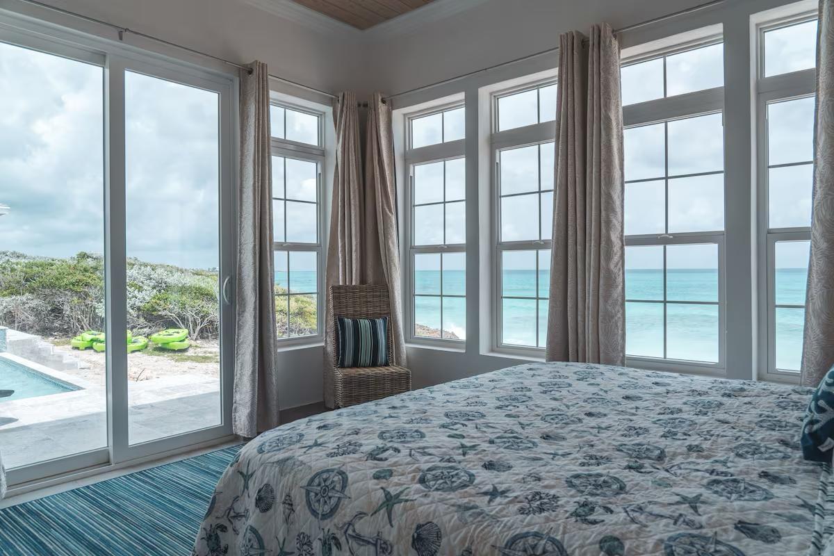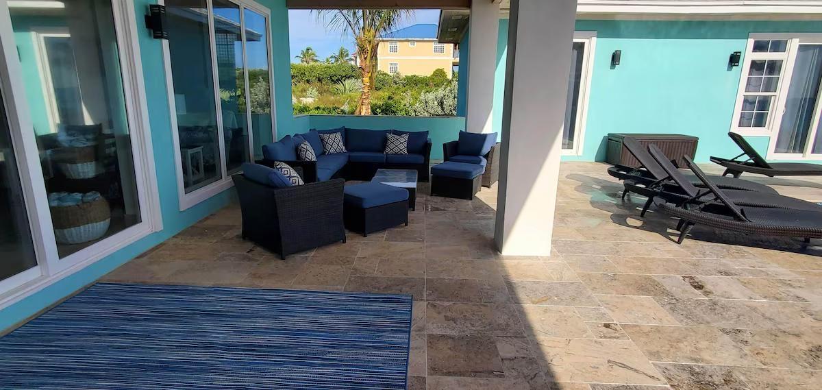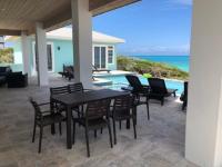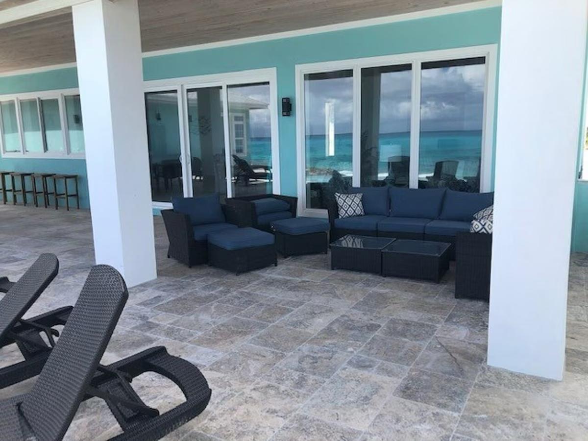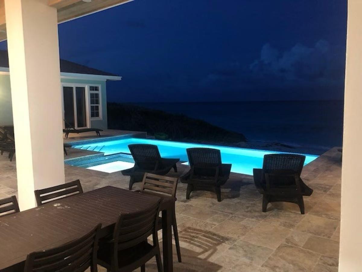 Positioned on a 20,000sqft lot with 98 feet of frontage on a powdery white sand beachfront, Treasure Cove Beach House is certainly a treasure in paradise. This 3500sqft 6 bedroom 5 bathroom luxurious home is nestled in the community of Farmer’s Hill in Great Exuma with privacy, all the amenities one could require and great snorkeling at its doorstep. The home is a short 10 minute drive from the Exuma International Airport which is currently undergoing extensive construction work to expand its ability to accommodate international arrivals. The home is designed with large families, elegance, comfort and enjoying the island in mind, and as you enter this becomes immediately evident. An open layout with high tongue-and-groove ceilings that holds a fully equipped kitchen with a large bi-fold window opening directly onto the pool deck, a 1,150sqft patio perched just above the Exuma Blues, a large heated infinity edged pool, hot tub, lounge seating and breathtaking views all make for the perfect island oasis. This home offers the perfect blend of indoor and outdoor entertainment, whether