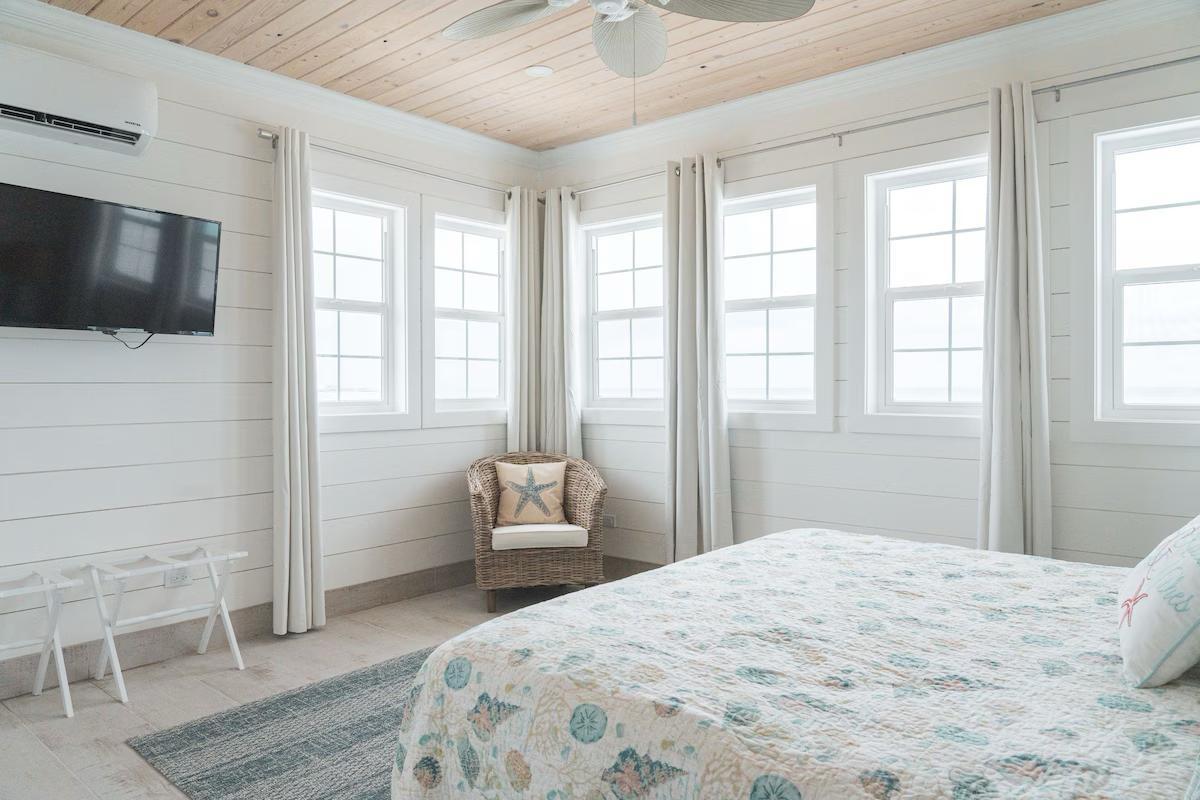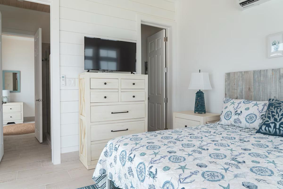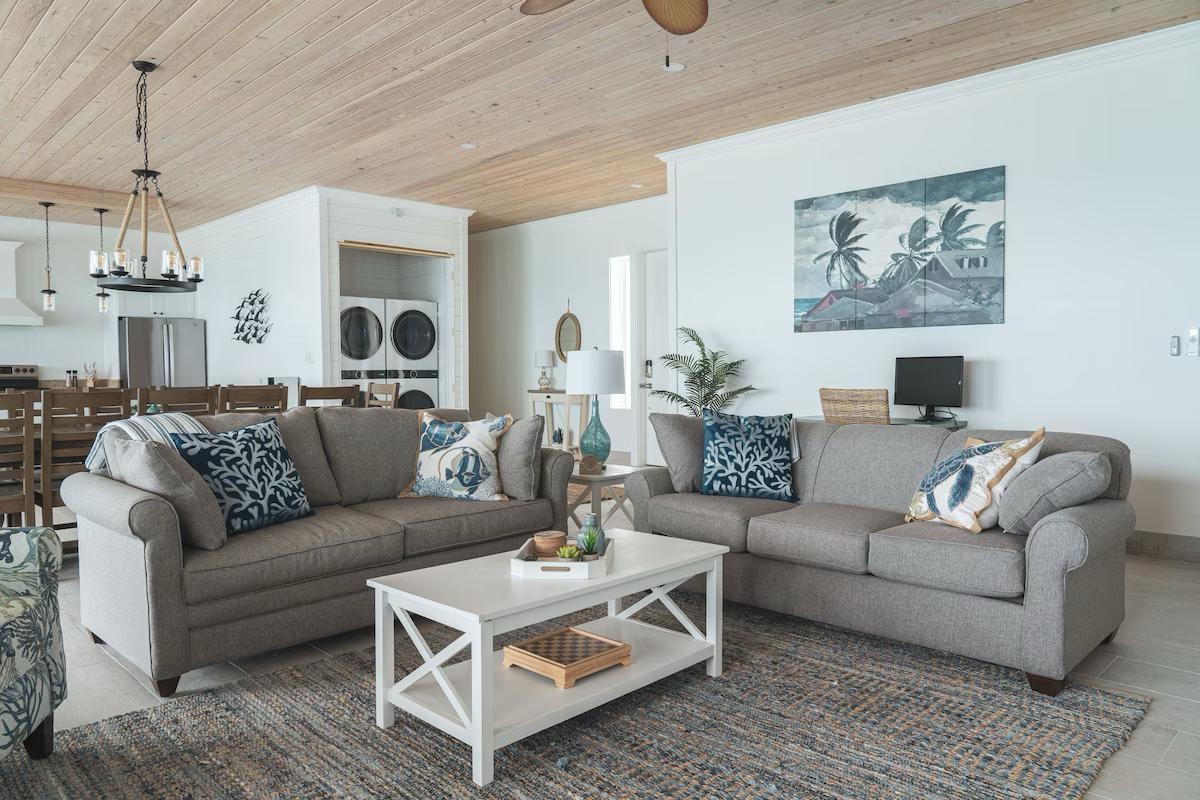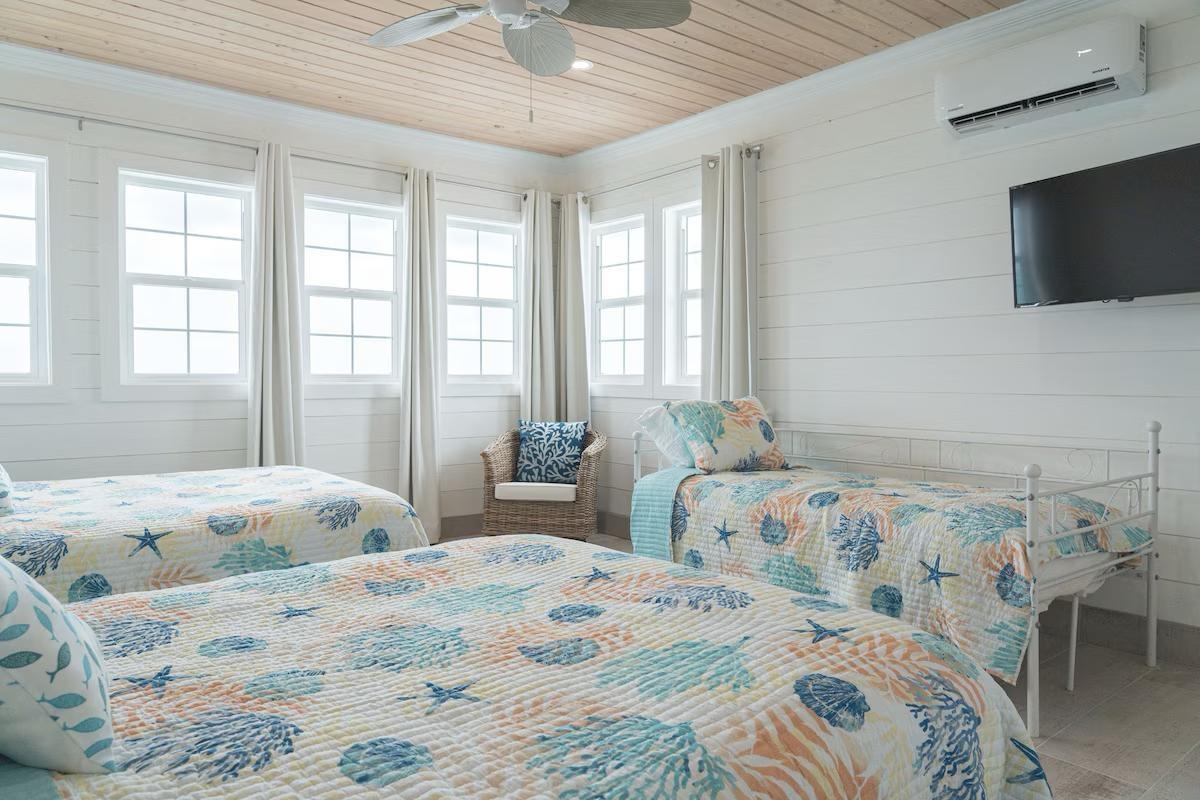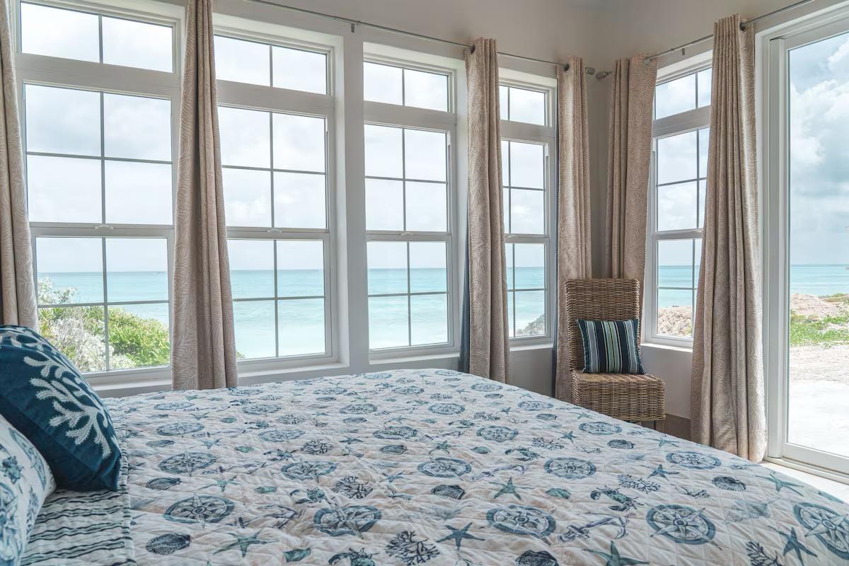 Positioned on a 20,000sqft lot with 98 feet of frontage on a powdery white sand beachfront, Treasure Cove Beach House is certainly a treasure in paradise. This 3500sqft 6 bedroom 5 bathroom luxurious home is nestled in the community of Farmer’s Hill in Great Exuma with privacy, all the amenities one could require and great snorkeling at its doorstep. The home is a short 10 minute drive from the Exuma International Airport which is currently undergoing extensive construction work to expand its ability to accommodate international arrivals. The home is designed with large families, elegance, comfort and enjoying the island in mind, and as you enter this becomes immediately evident. An open layout with high tongue-and-groove ceilings that holds a fully equipped kitchen with a large bi-fold window opening directly onto the pool deck, a 1,150sqft patio perched just above the Exuma Blues, a large heated infinity edged pool, hot tub, lounge seating and breathtaking views all make for the perfect island oasis. This home offers the perfect blend of indoor and outdoor entertainment, whether