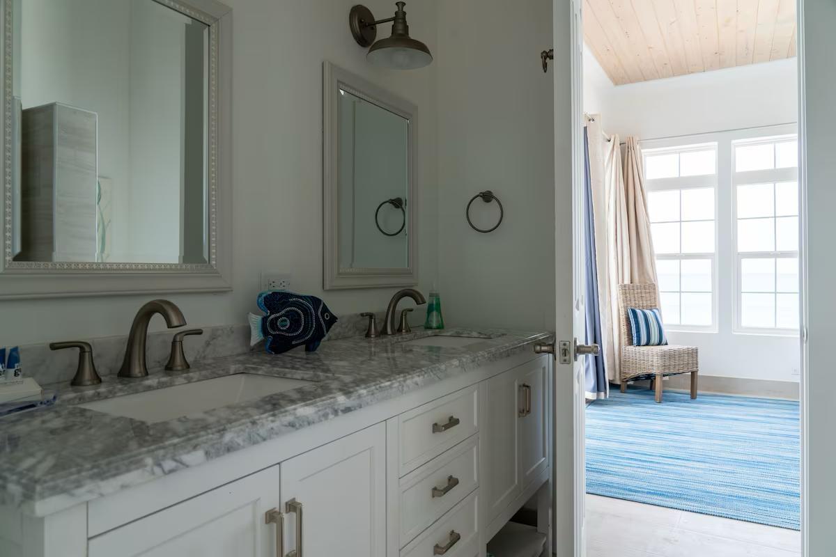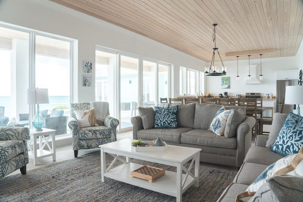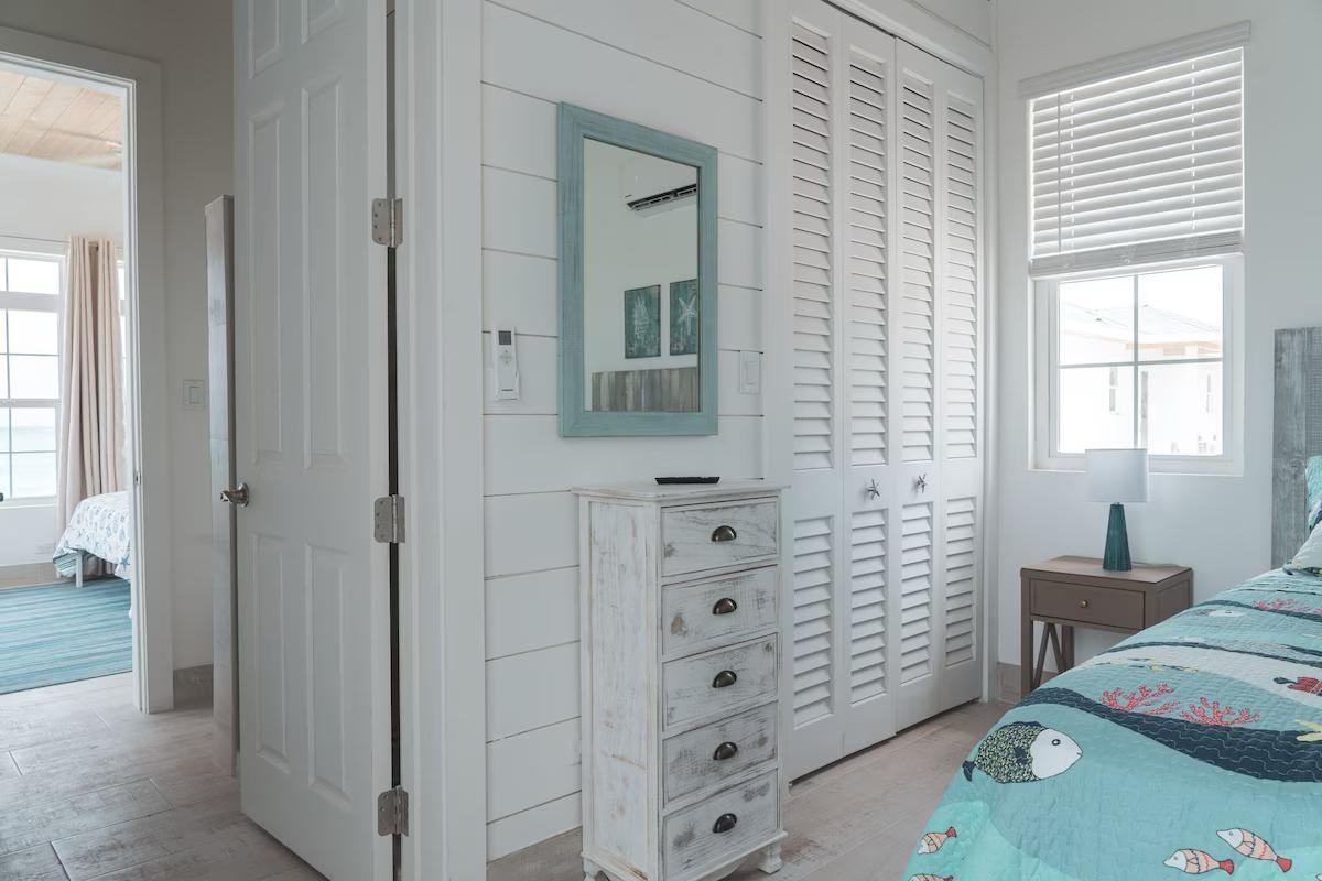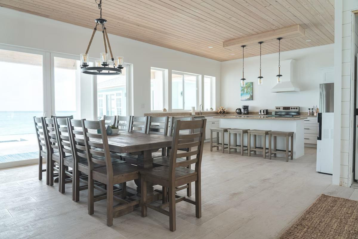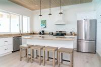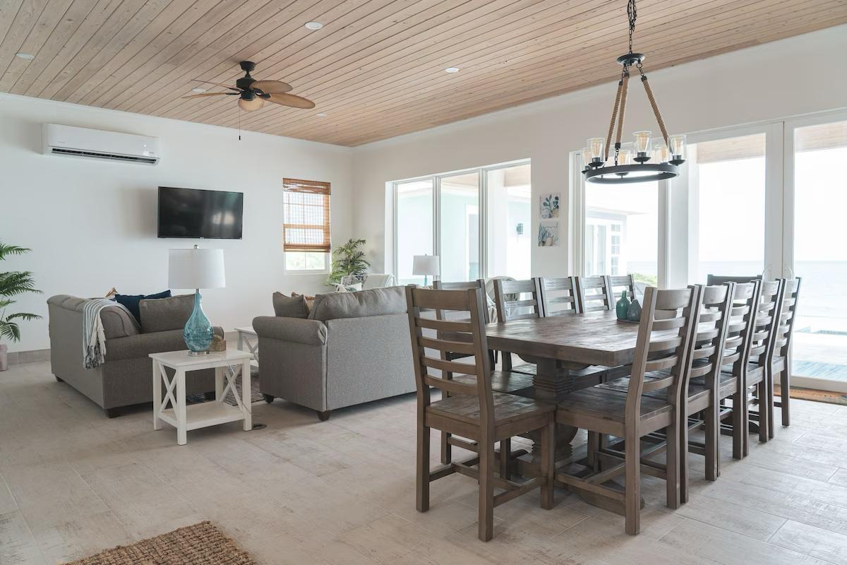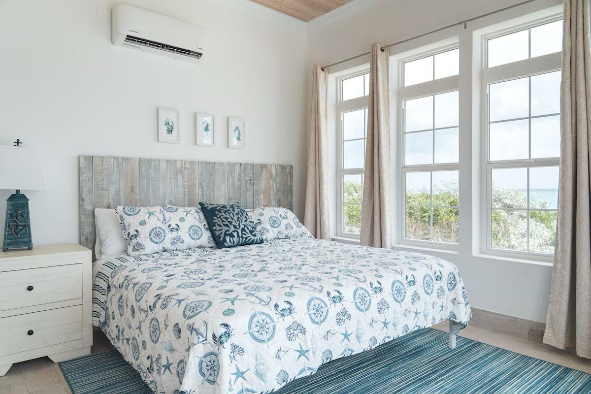 Positioned on a 20,000sqft lot with 98 feet of frontage on a powdery white sand beachfront, Treasure Cove Beach House is certainly a treasure in paradise. This 3500sqft 6 bedroom 5 bathroom luxurious home is nestled in the community of Farmer’s Hill in Great Exuma with privacy, all the amenities one could require and great snorkeling at its doorstep. The home is a short 10 minute drive from the Exuma International Airport which is currently undergoing extensive construction work to expand its ability to accommodate international arrivals. The home is designed with large families, elegance, comfort and enjoying the island in mind, and as you enter this becomes immediately evident. An open layout with high tongue-and-groove ceilings that holds a fully equipped kitchen with a large bi-fold window opening directly onto the pool deck, a 1,150sqft patio perched just above the Exuma Blues, a large heated infinity edged pool, hot tub, lounge seating and breathtaking views all make for the perfect island oasis. This home offers the perfect blend of indoor and outdoor entertainment, whether