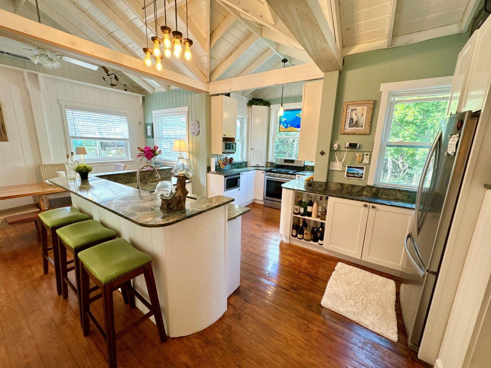 The Green House and Cat 6 Cabana is a unique waterfront compound on Lubbers offering privacy, boating access, and authentic island living. Situated on 1.6 acres with 240 ft of waterfront, this property is ideally located with Atlantic access in just minutes and perfect for world class fishing and boating. The estate includes two residences The Green House, a beautifully updated 2 bed, 2 bath, 1200 SF main home with custom kitchen, wraparound deck, hardwood and tile floors, impact windows, and mini split AC. Cat 6 Cabana is a modern 1 bed, 1 bath 600 SF waterfront guest house with open living space, a large deck and private balcony overlooking the water. The property also features a 110 ft dock with 4 slips, 16K lb boat lift, low dock, fish cleaning station and electric/water service which make this property ideal for boaters. Additional features include a boat ramp with electric winch, tropical landscaping with fruit trees, garden greenhouse and multiple storage and generator sheds. A rare opportunity to own a fully equipped waterfront retreat in the Abacos.