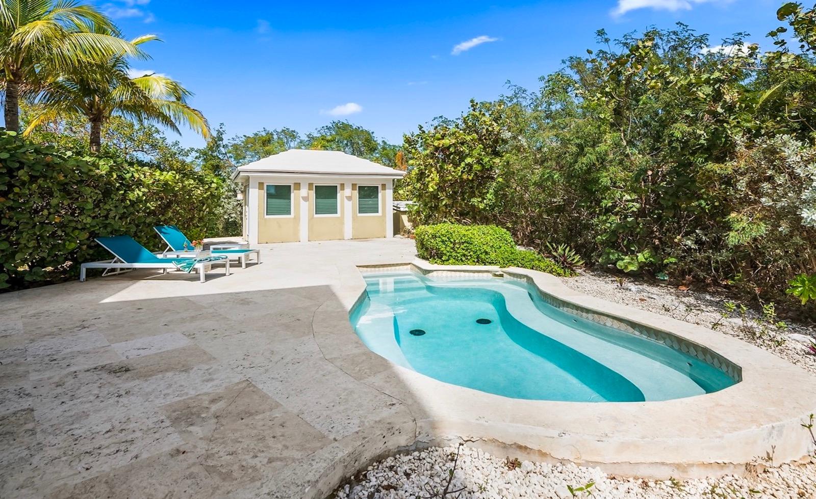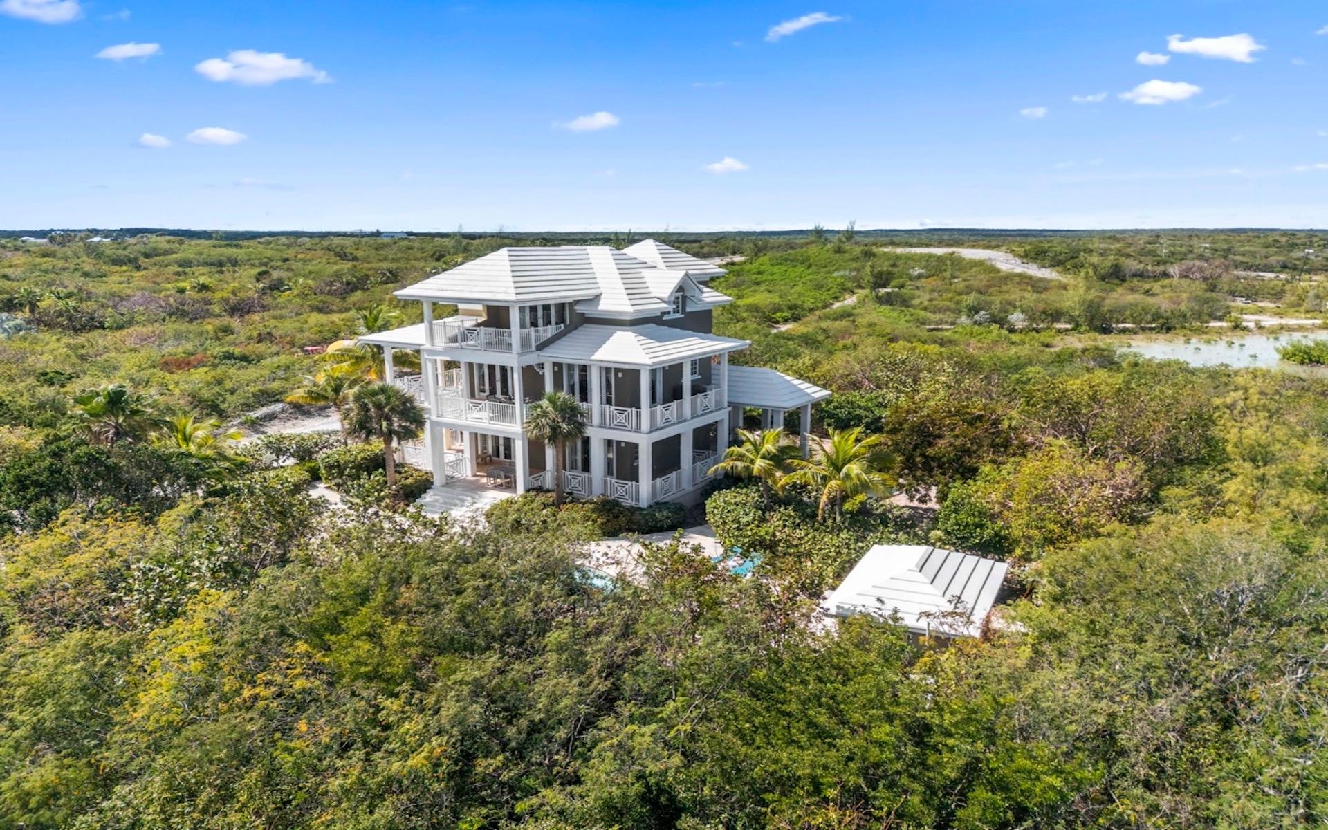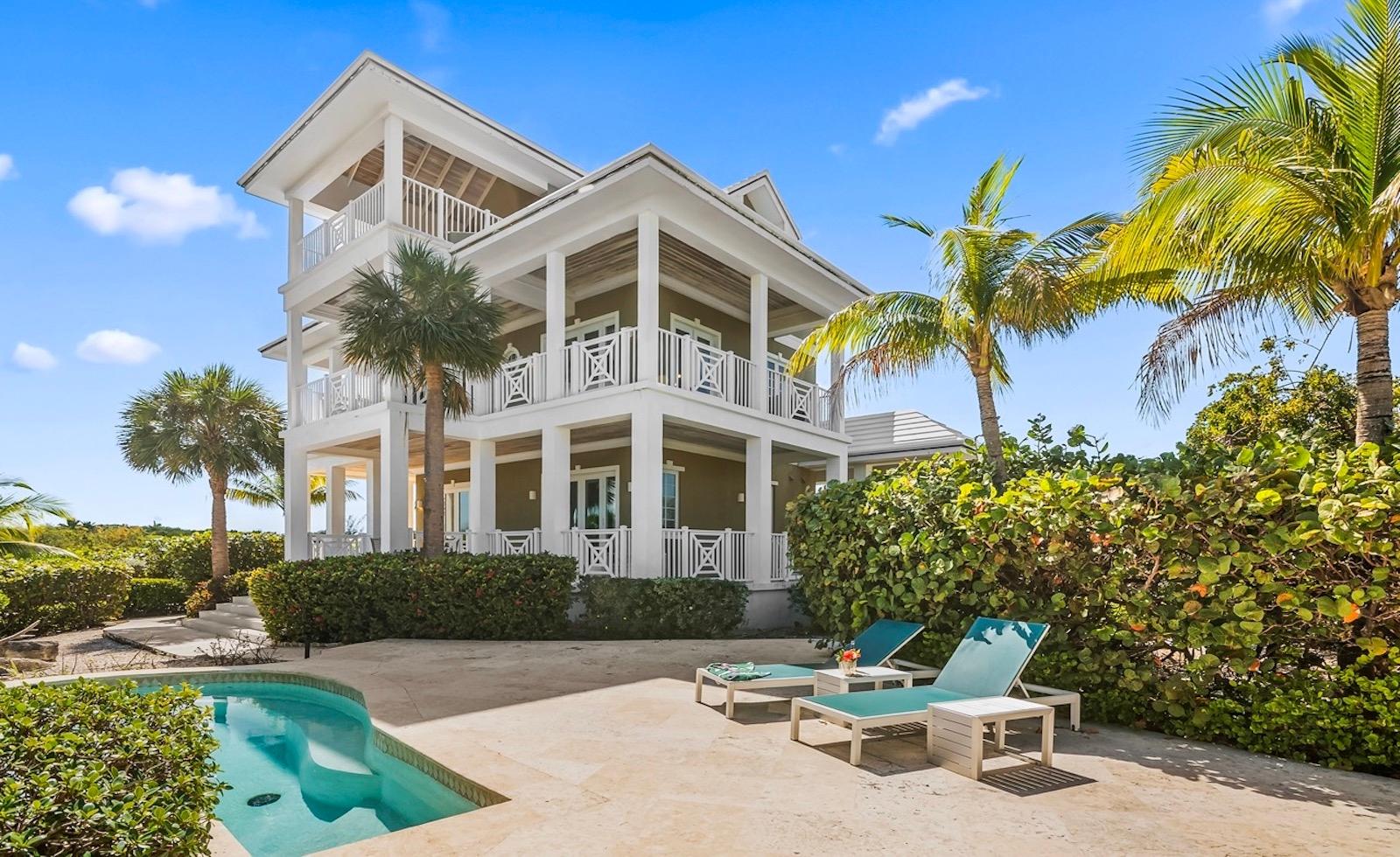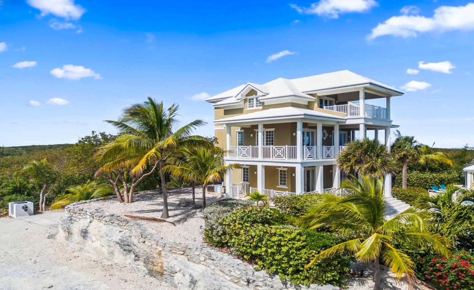 Within the exclusive gated community of February Point, this desirable residence combines elegant island living with an unbeatable investment opportunity. Perfectly positioned on 0.33 acres of lush landscape, offering complete privacy, the estate has breathtaking panoramas over the brilliant turquoise waters of Elizabeth Harbour. Professionally designed and fully furnished interiors, complete upscale finishes, span nearly 3,000 sq ft across three levels. Tray ceilings and elegant lighting complement the living room; a chef’s kitchen boasts modern appliances and a breakfast bar; a powder room on the main level; and 1,800 sq ft of covered balconies capture constant ocean breezes. Three ensuite bedrooms include the primary retreat, featuring a Jacuzzi soaking tub, walk-in shower, and separate his-and-hers vanities and closets. A guest cottage provides comfortable accommodations, while a plunge pool and covered dining terrace create a relaxed outdoor setting, and cascading bougainvillea lead toward the shoreline and beyond to a sandy beach and volleyball court with deeded park access