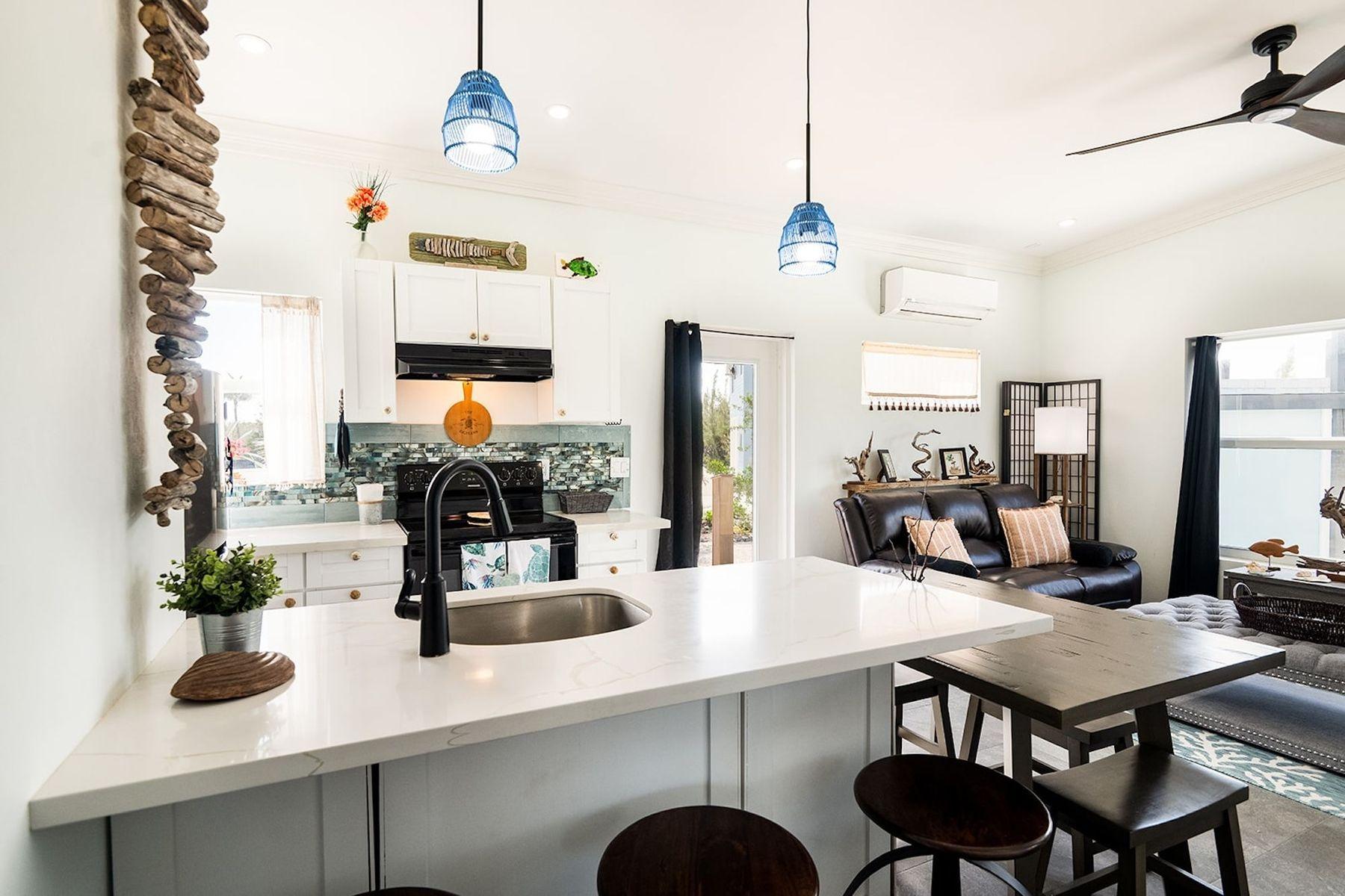 Positioned on the main canal in Leisure Lee, this solid concrete block waterfront residence offers 121 feet of bulkheaded frontage on a 10,590 sq ft lot with a 33 ft private dock and over 6 ft minimum low tide depth. Encompassing 820 sq ft, the home features water views from every room, 1 bedroom plus flexible den, 2 bathrooms, quartz countertops, white shaker cabinetry, stainless appliances, and indoor outdoor tile throughout. Built high and dry on a 4 ft poured concrete foundation with metal roof, accordion shutters, zoned mini splitHVAC, water storage tank, and outdoor shower. Beach access included. Rental Available.